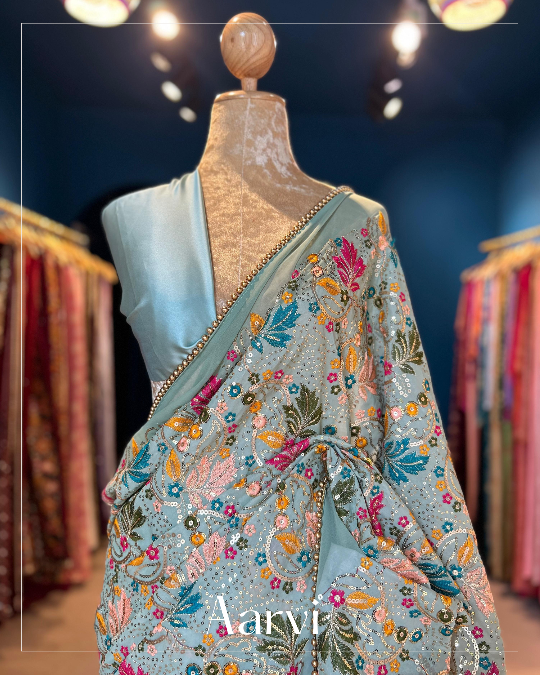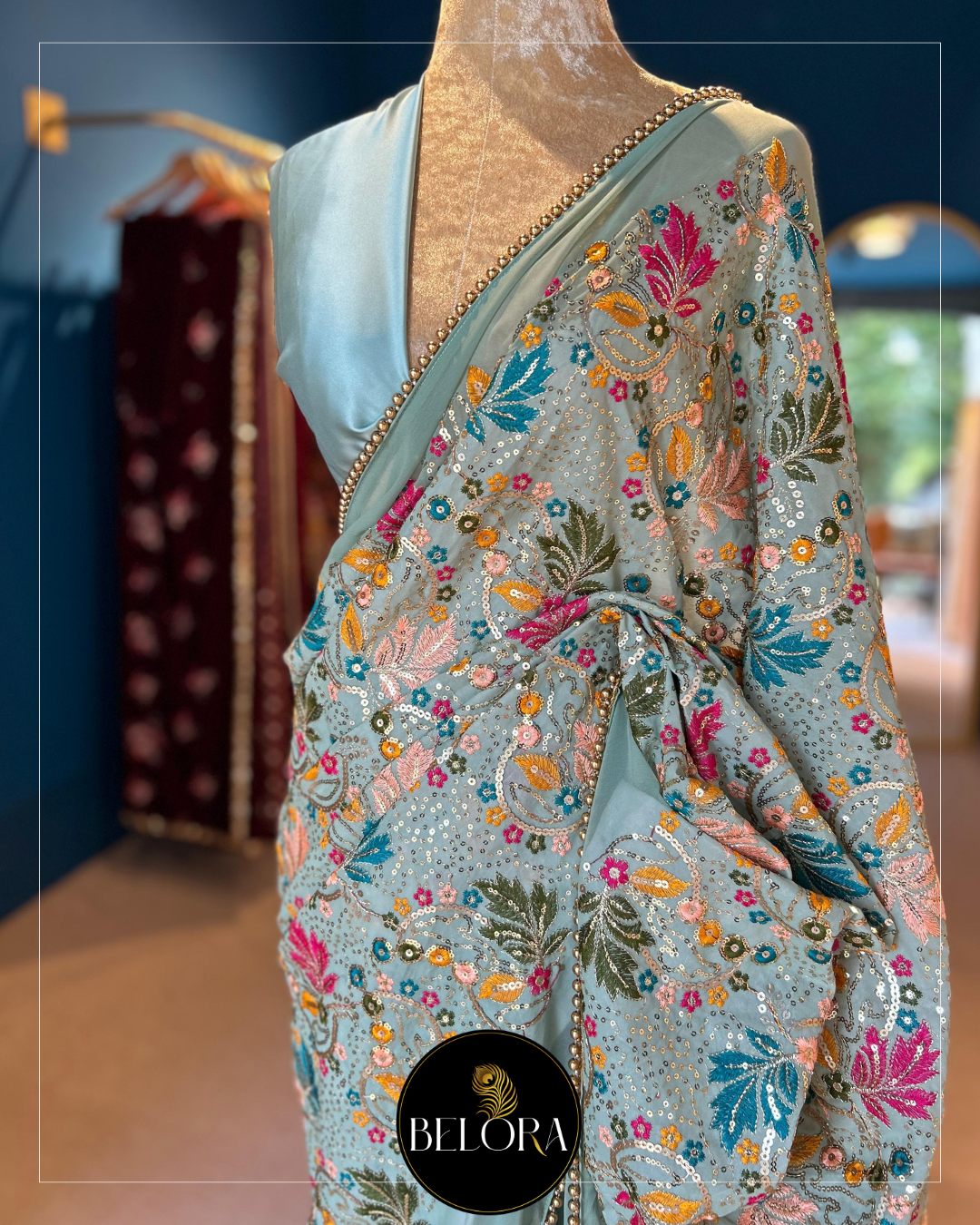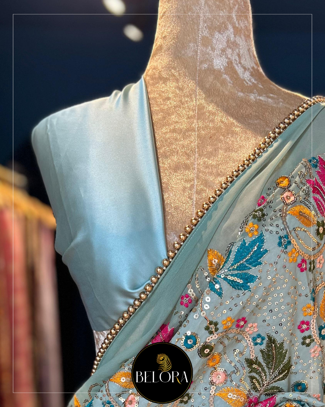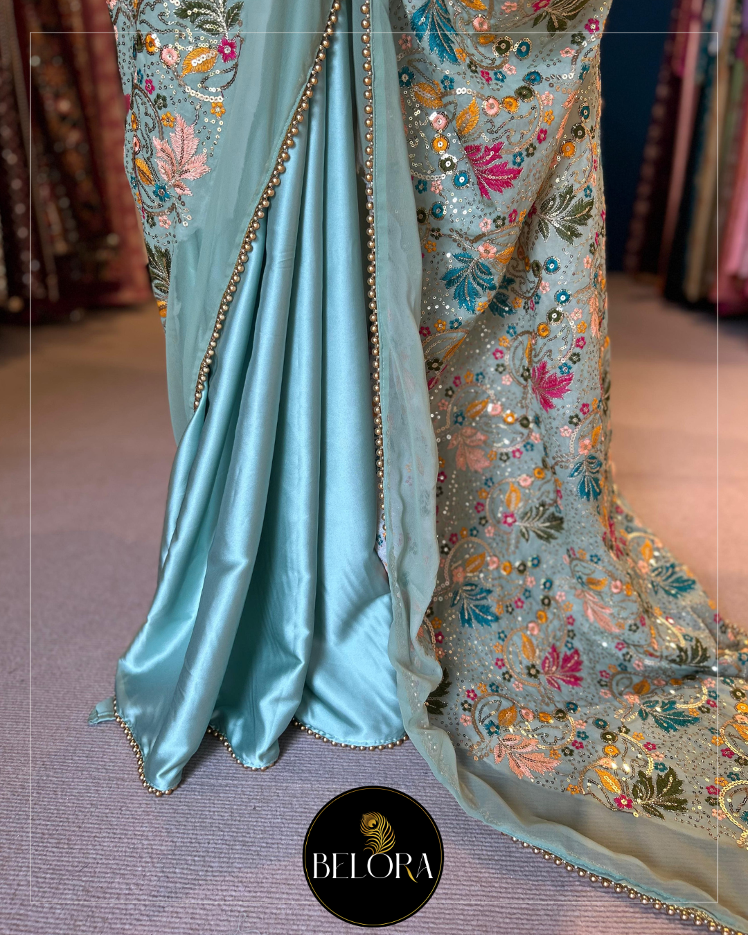 Saree: 6 yards of half and half sequin embroidery fall and Armani silk bottom saree in Mint green colour and designed with gold pearls.