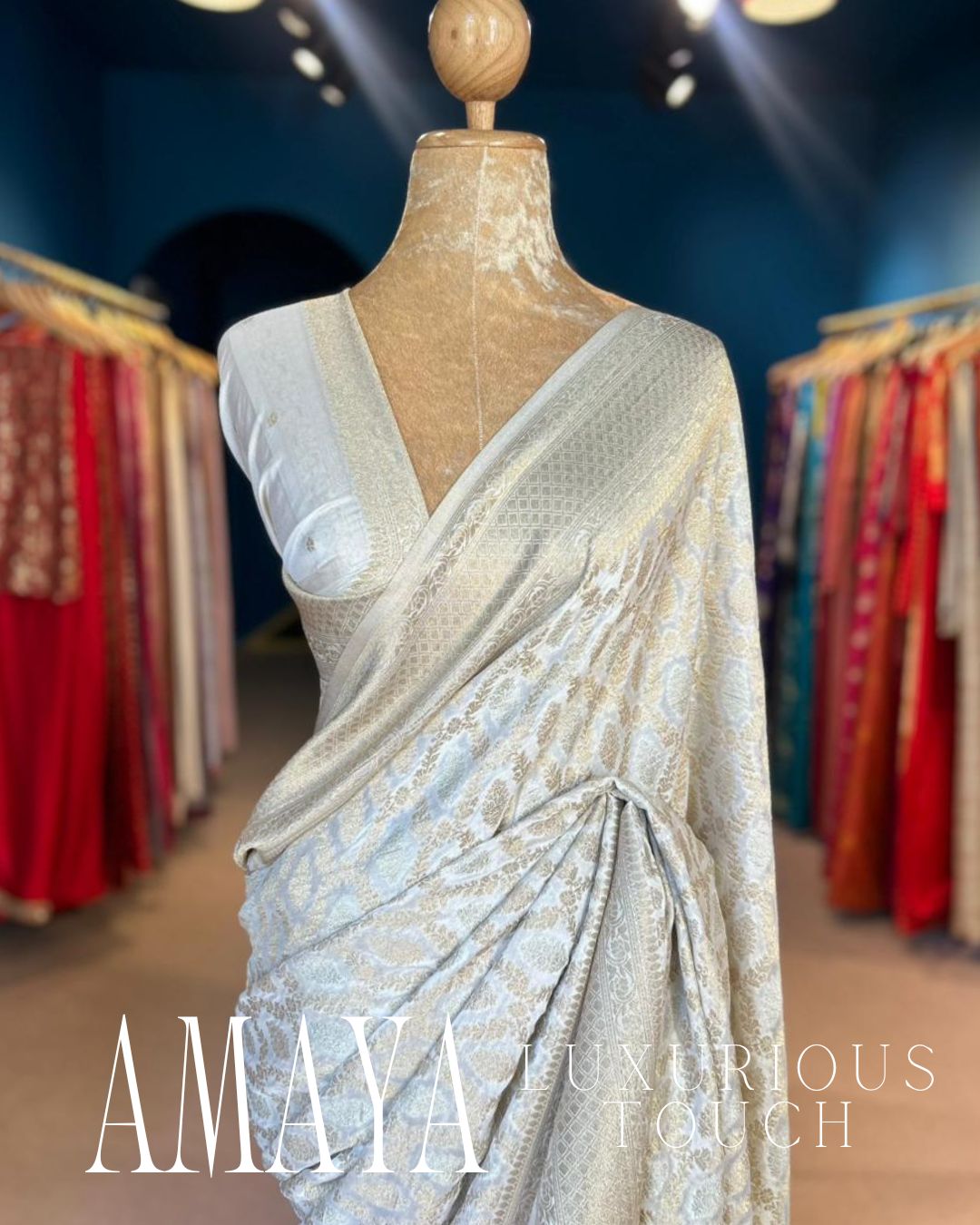 Saree: 6 yards of Pure Crape Silk Saree in Off white color with Dull Gold Thread work