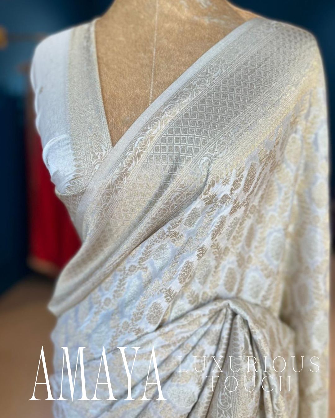Saree: 6 yards of Pure Crape Silk Saree in Off white color with Dull Gold Thread work