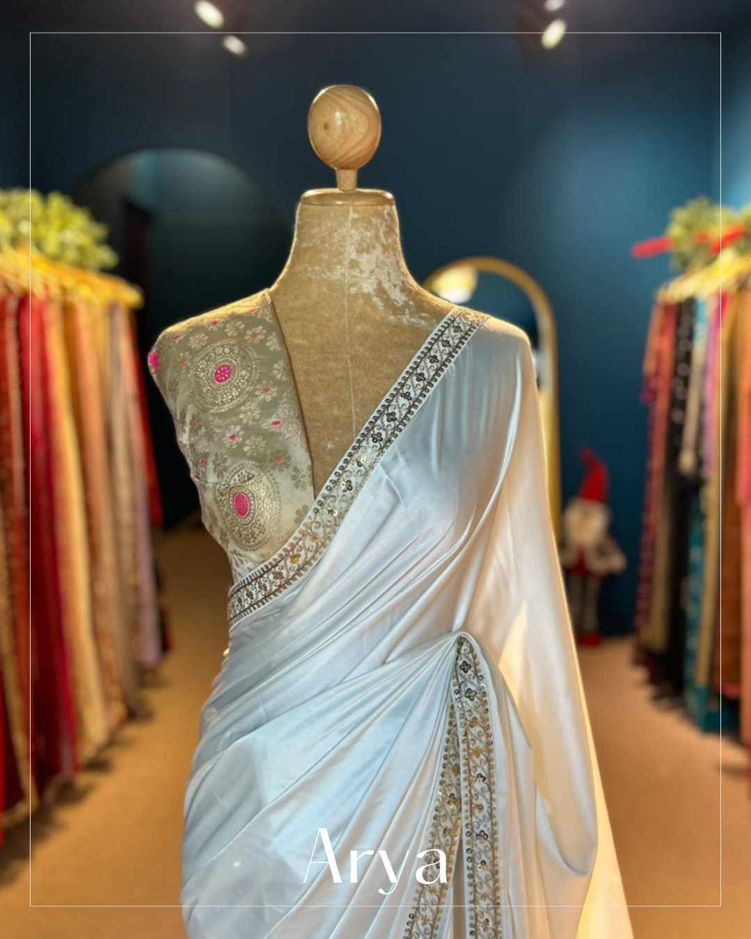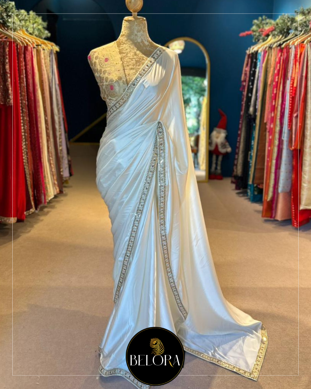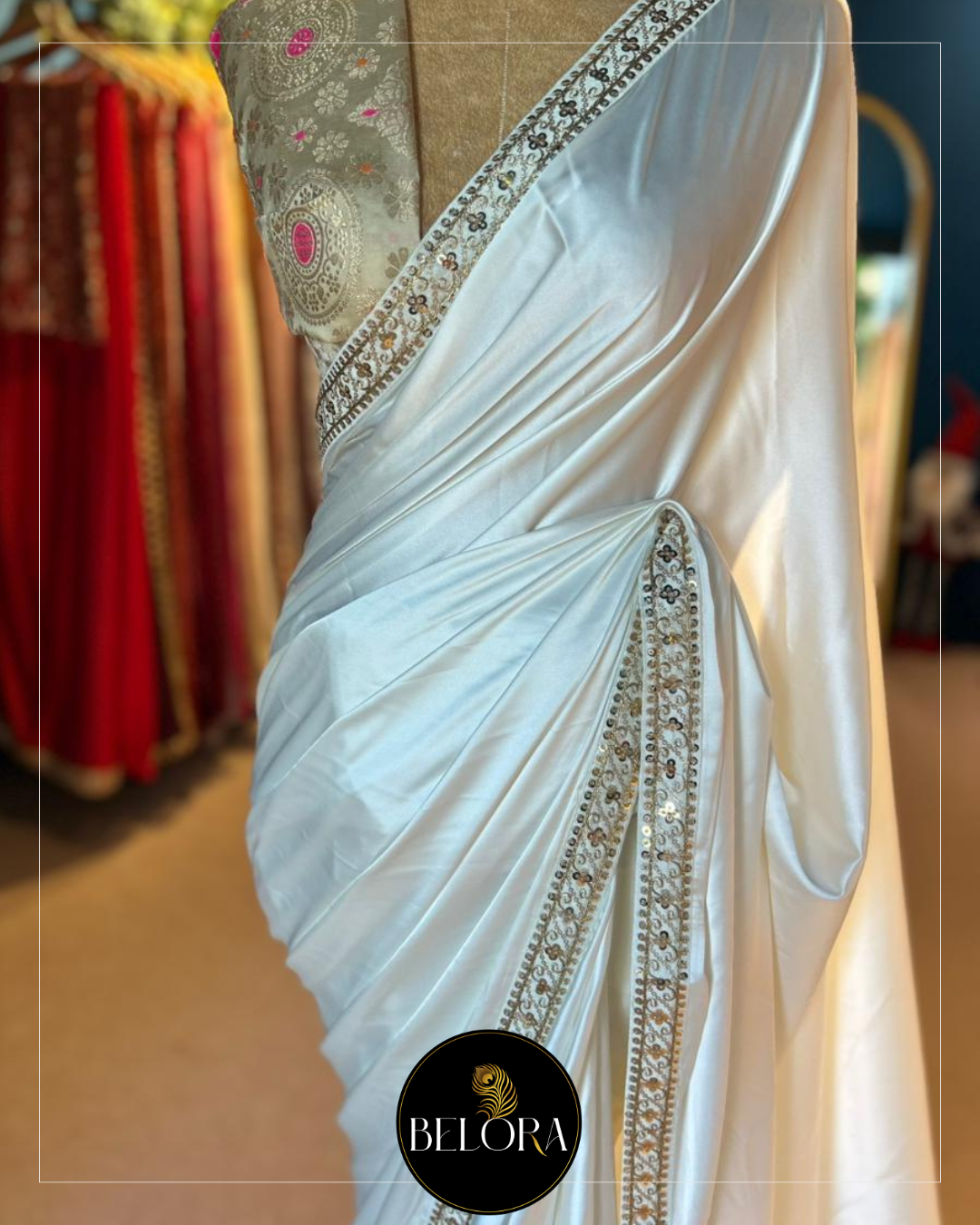 Saree: 6 yards of Armani silk saree in White colour and designed with white designer lace.