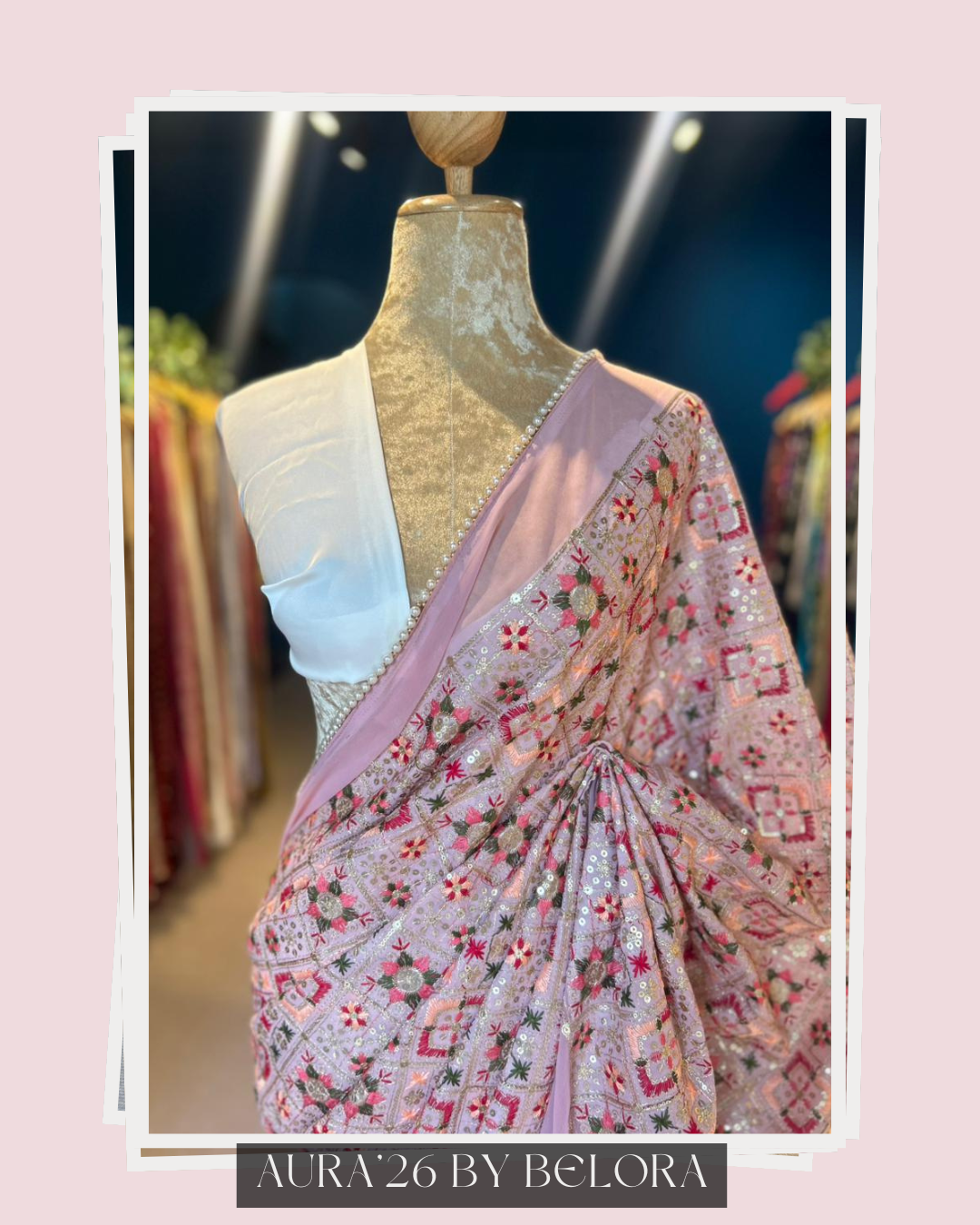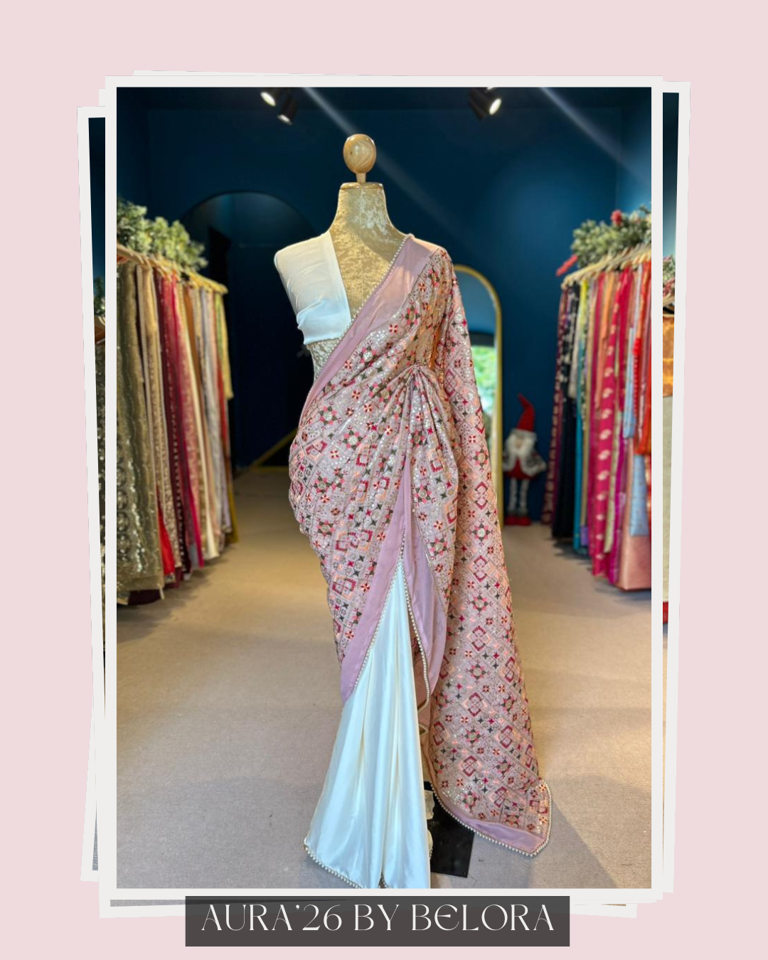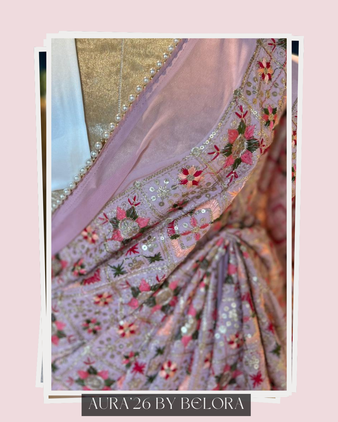 Saree: 6 yards of half and half Pink sequin embroidery fall and White Armani silk bottom saree designed with gold pearls.