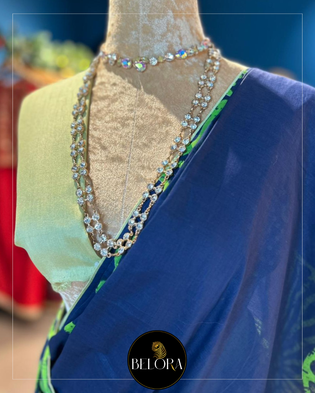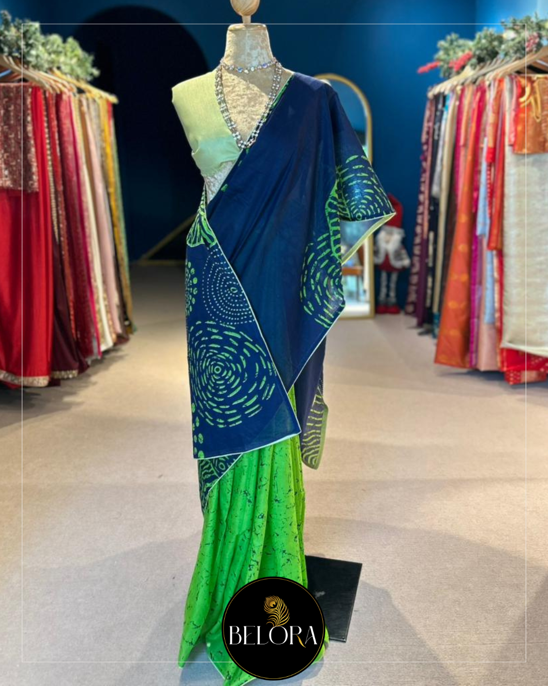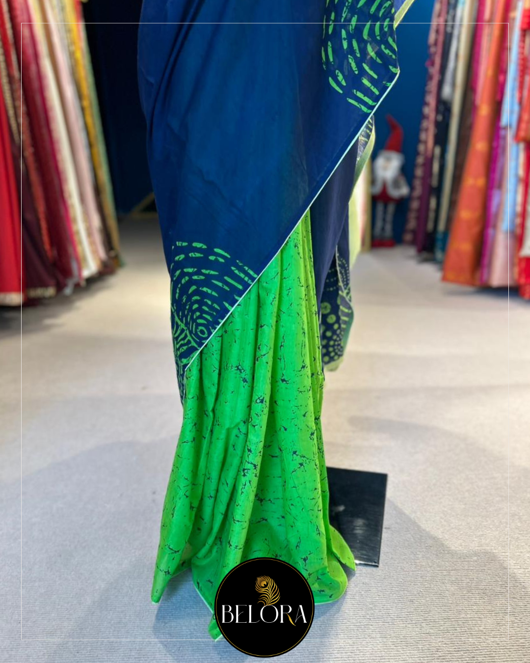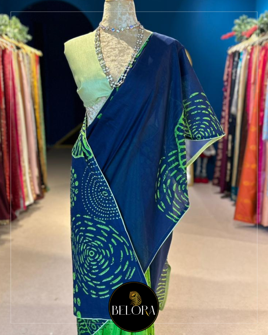 Saree: 6 yards of Cotton saree in Blue and Dark green colour and designed with Light green piping.