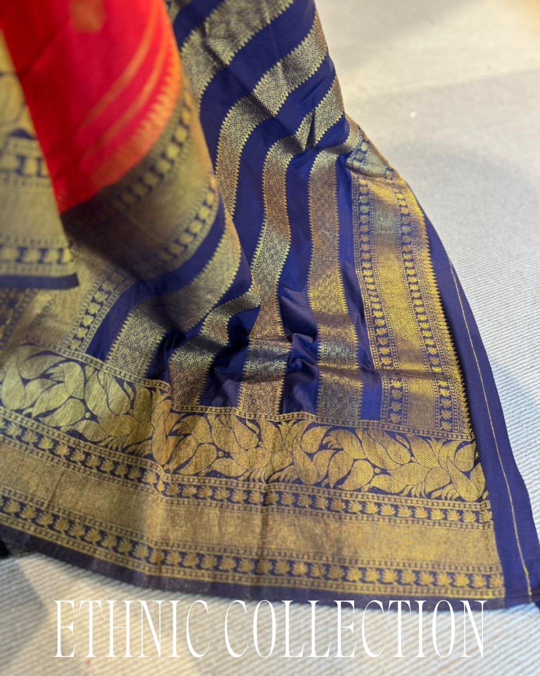 Saree: 6 yards of Crape silk Designer Saree in Cherry red and Navy blue colour and Gold Thread Weaving.