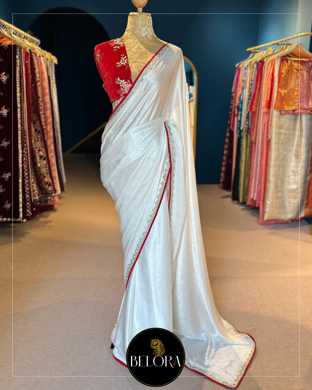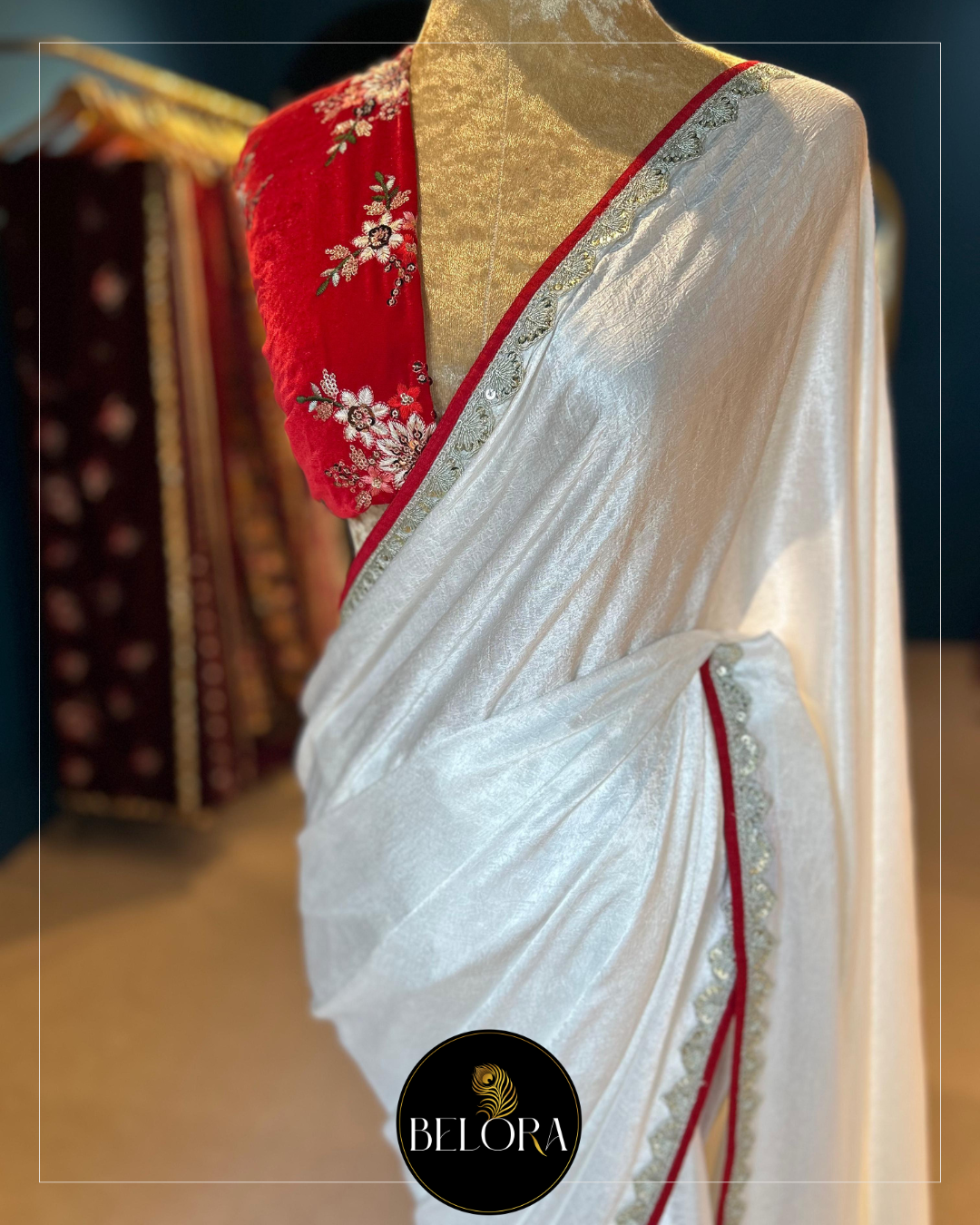 Saree: 6 yards of Crape Silk Saree in White Colour designed with dull gold border and red piping.