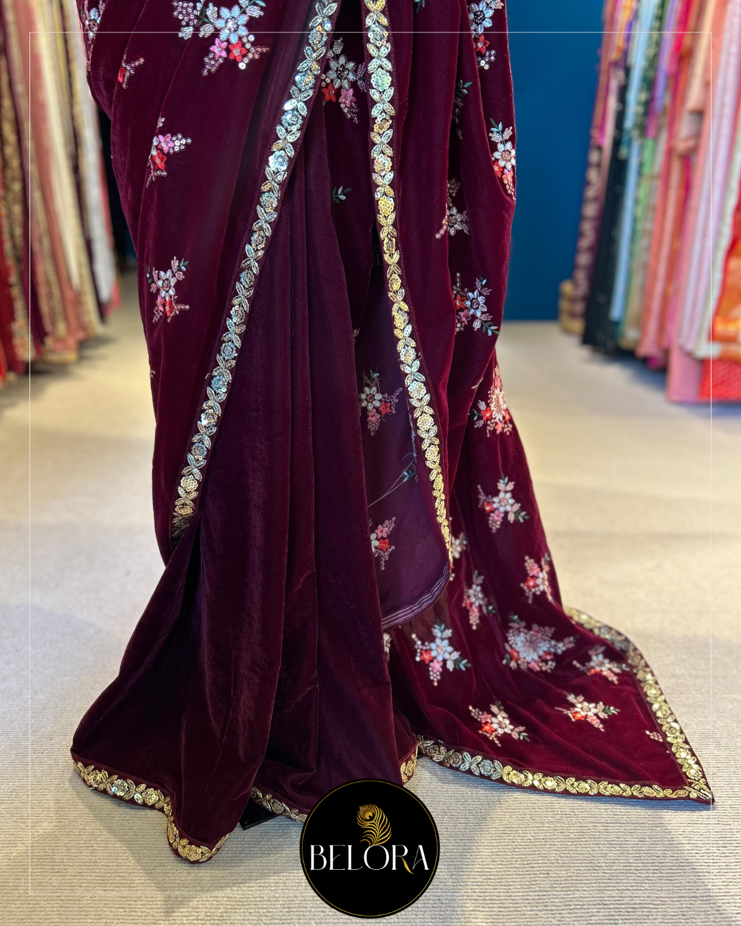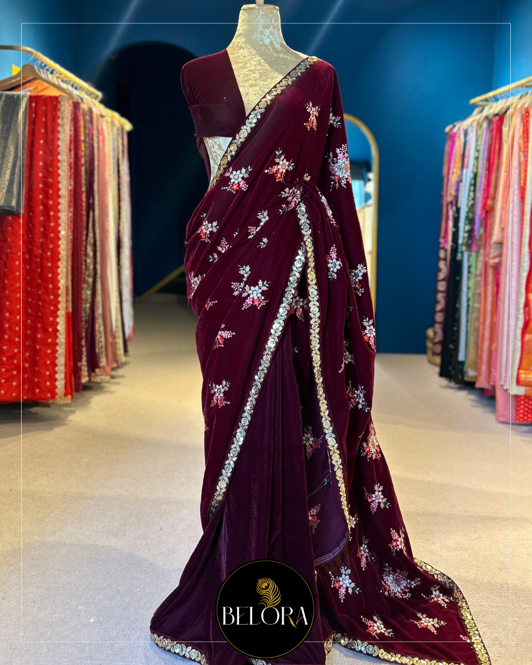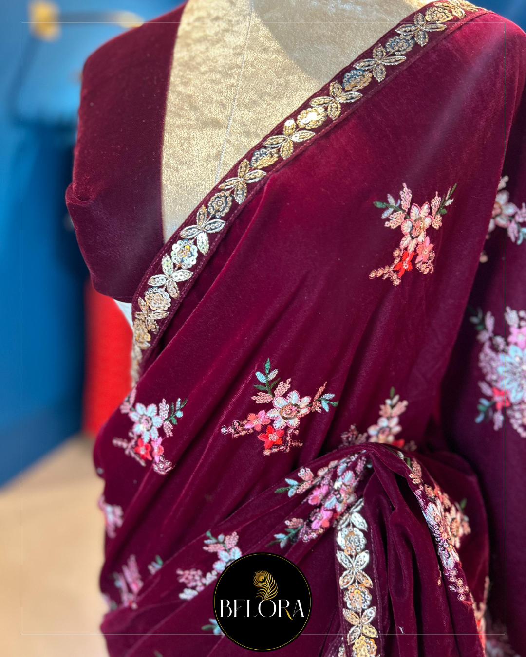 Saree: 6 yards of half and half embroidery velvet saree in Maroon colour and designed with maroon velvet designer lace.