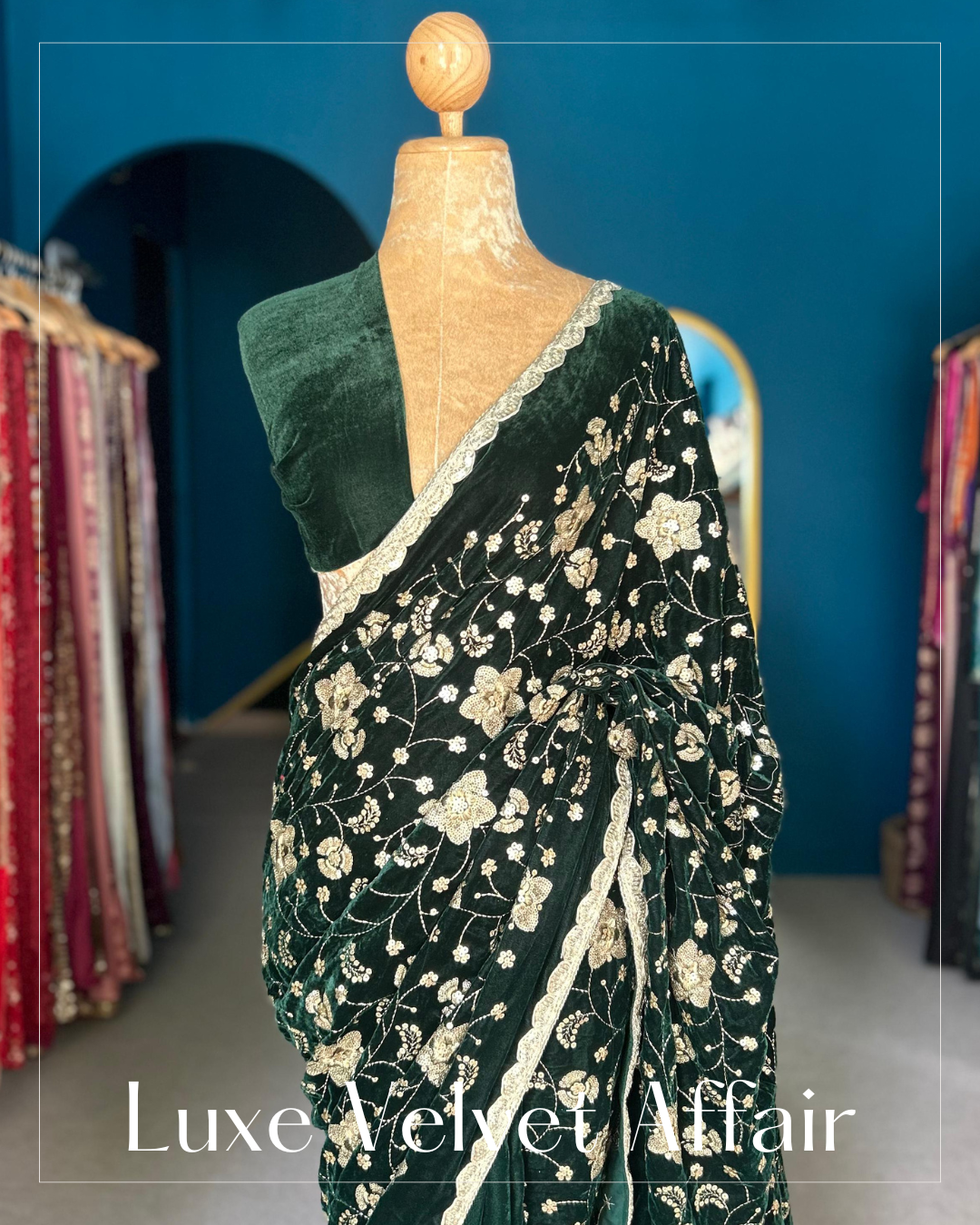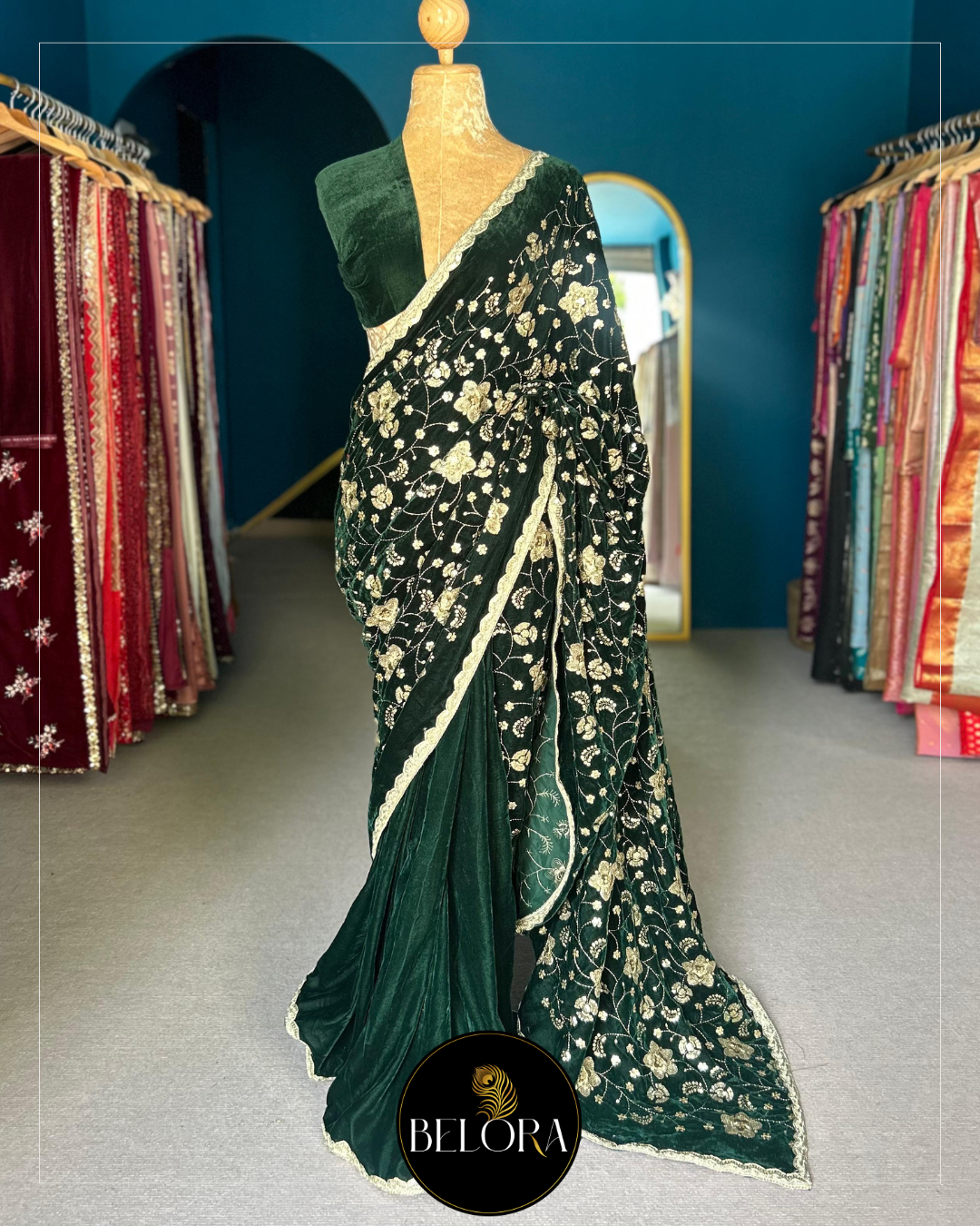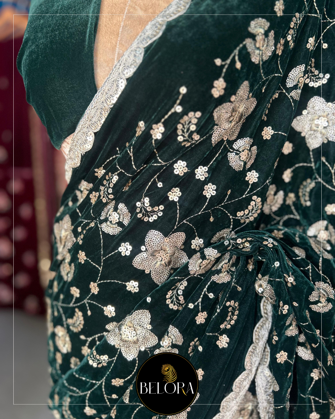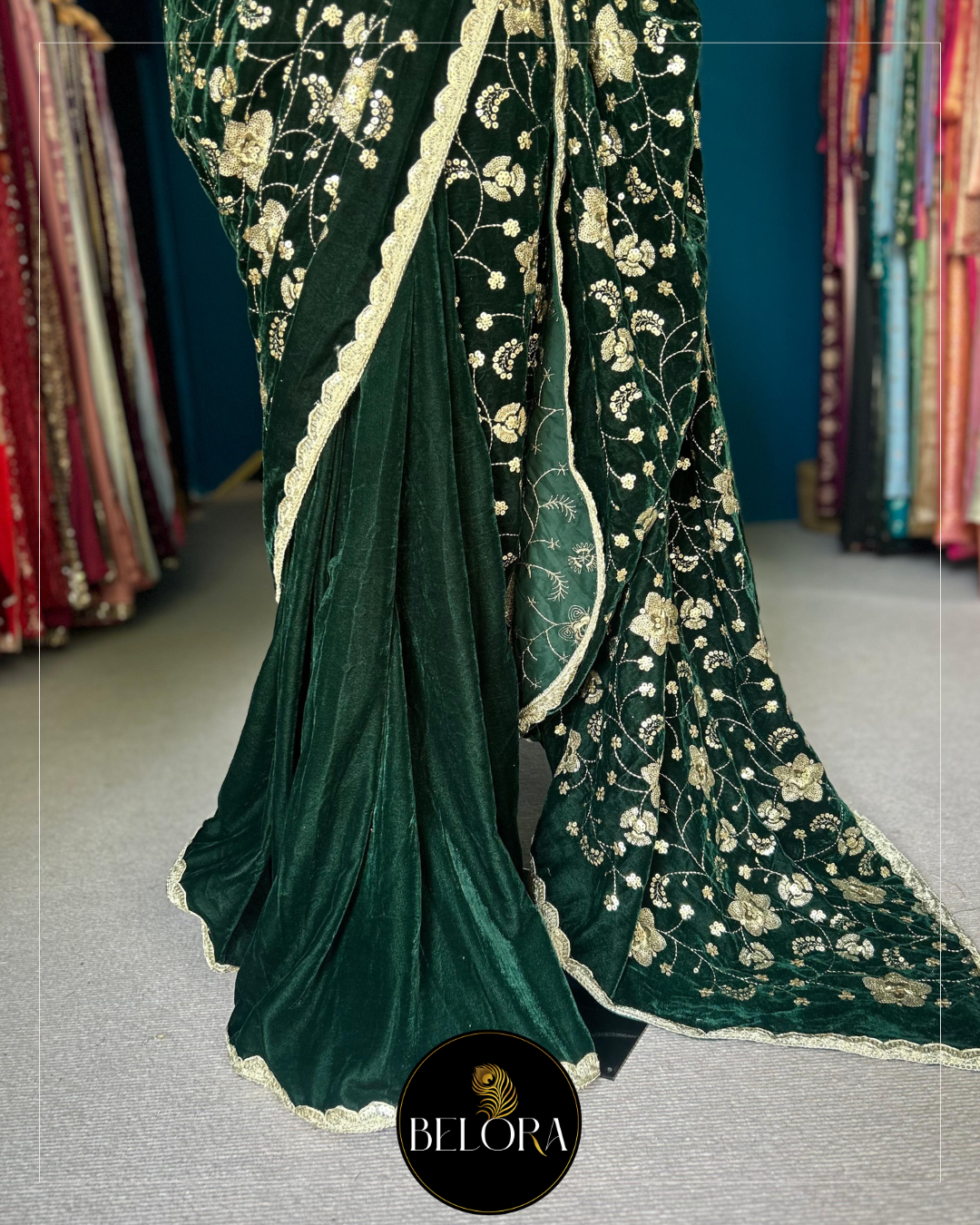 Saree: 6 yards of half and half embroidery velvet saree in Green colour and designed with dull gold designer lace.