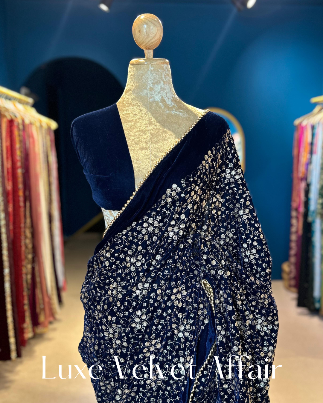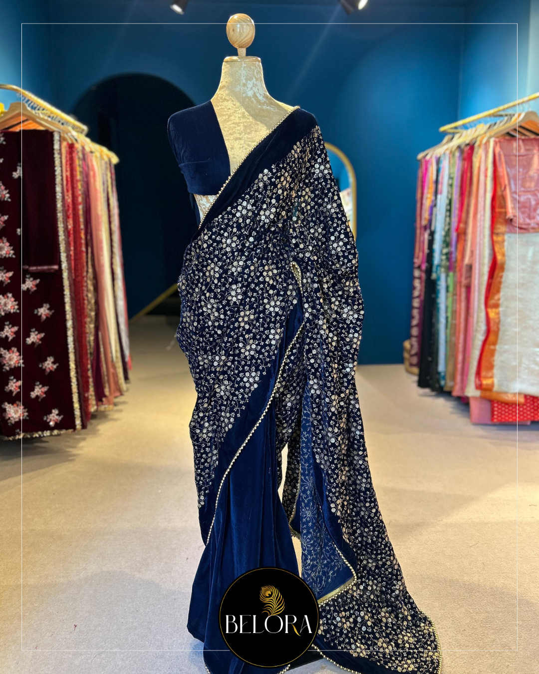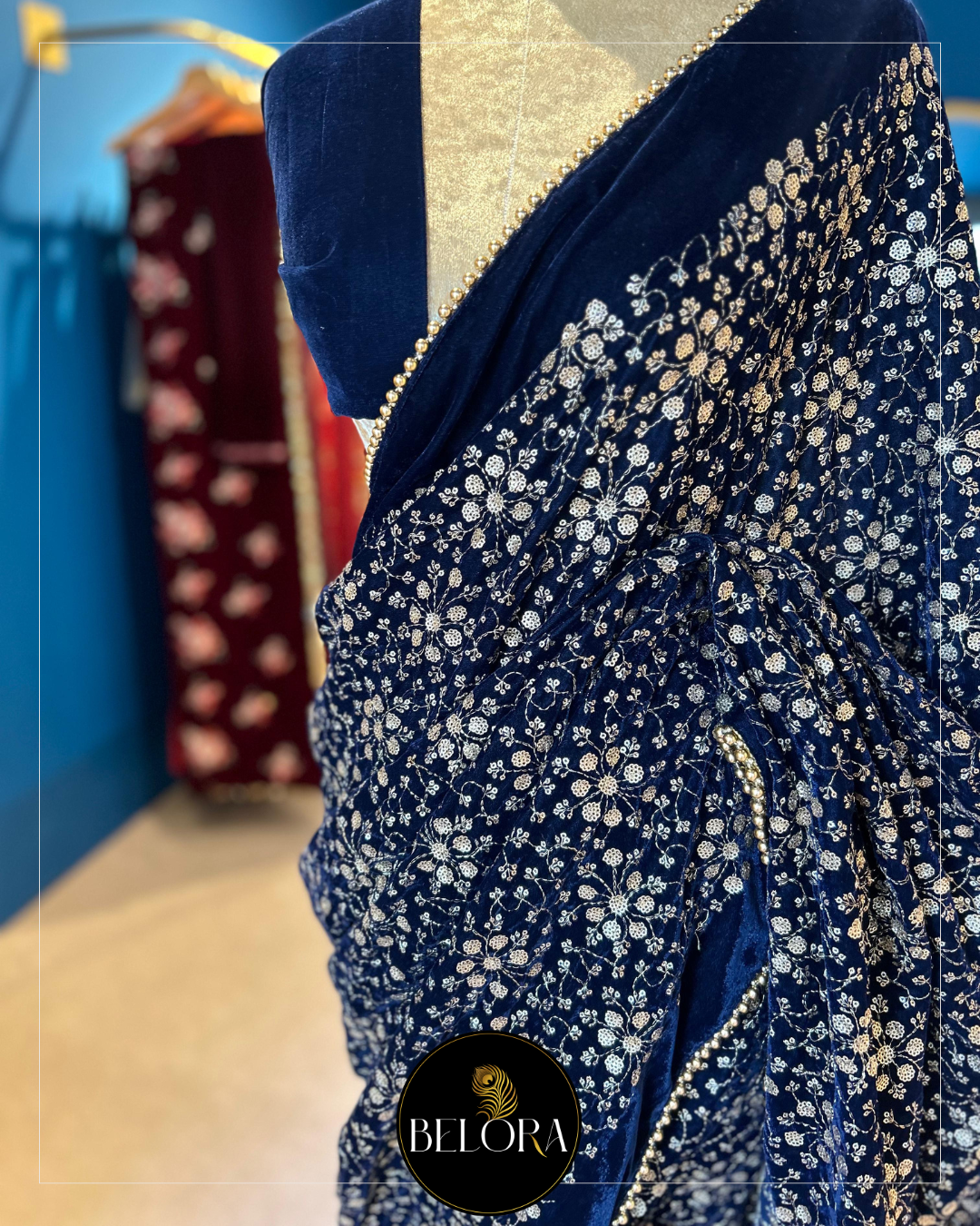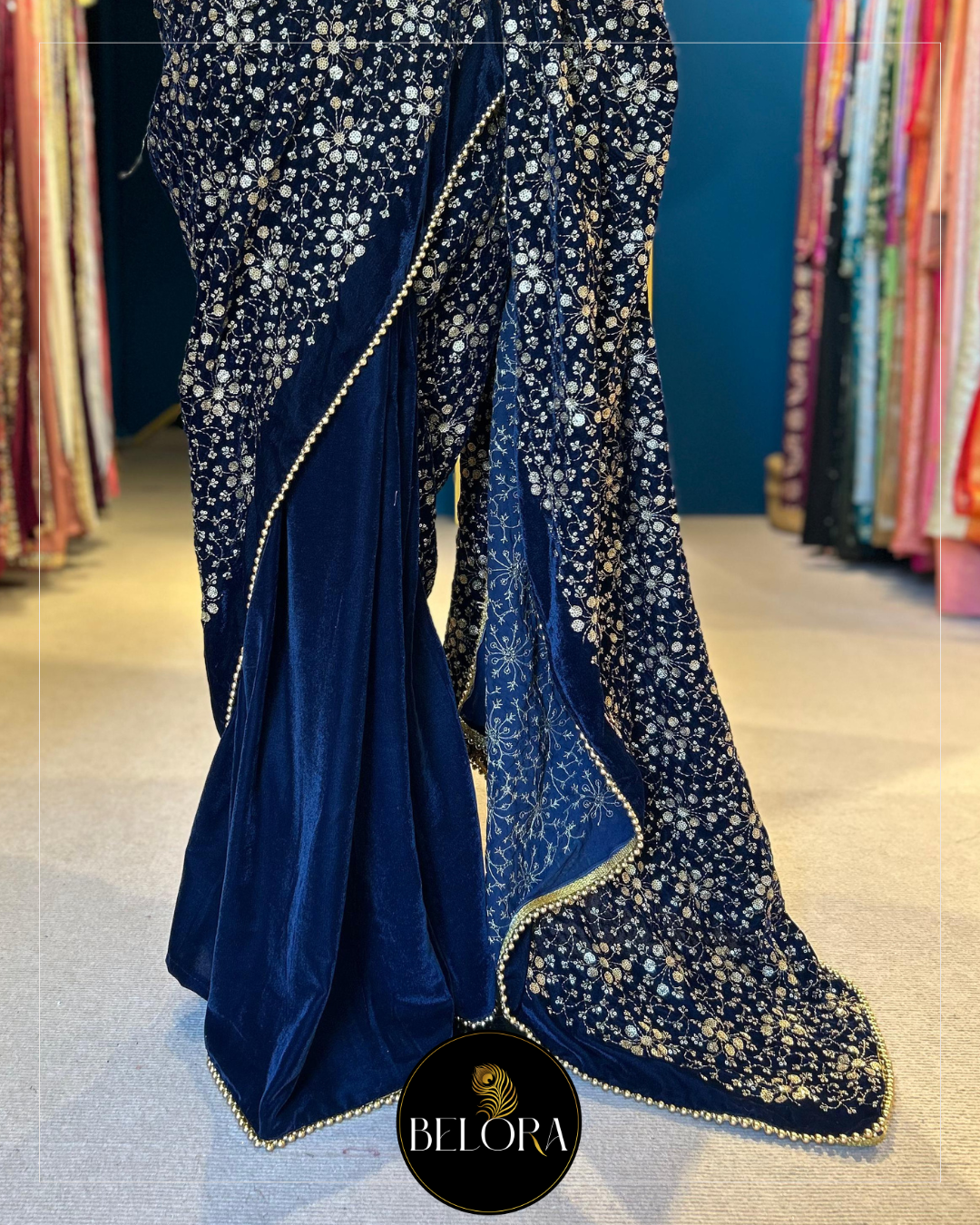 Saree: 6 yards of half and half embroidery velvet saree in Navy blue colour and designed with gold pearls.