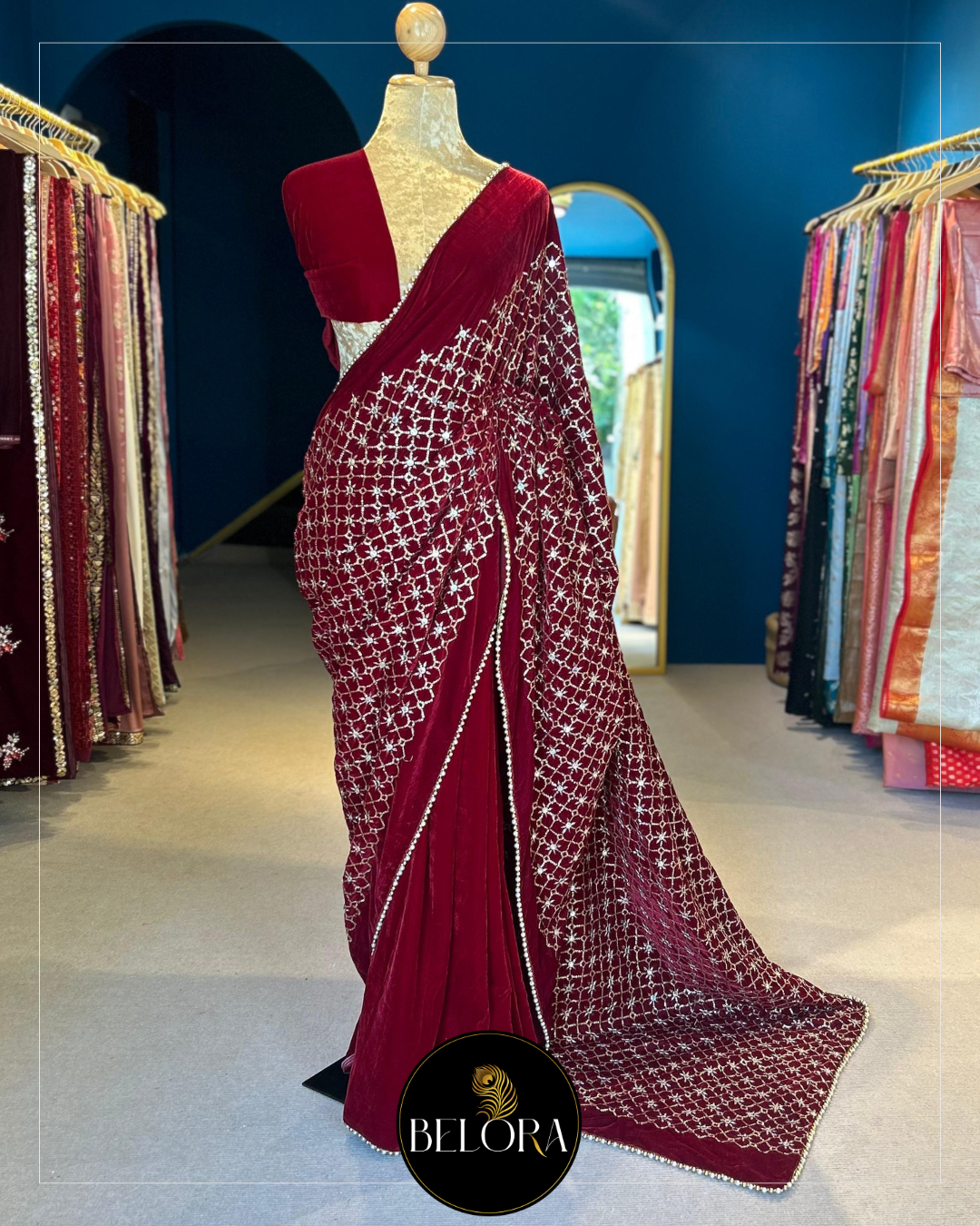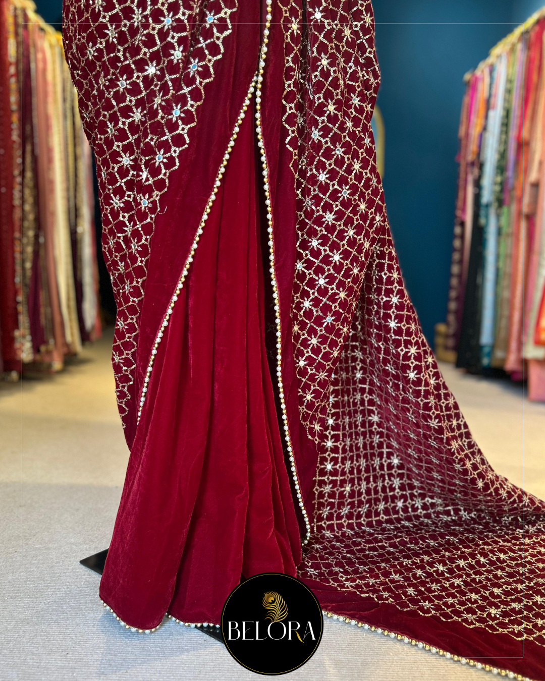 Saree: 6 yards of half and half embroidery velvet saree in Red colour and designed with white and gold pearls