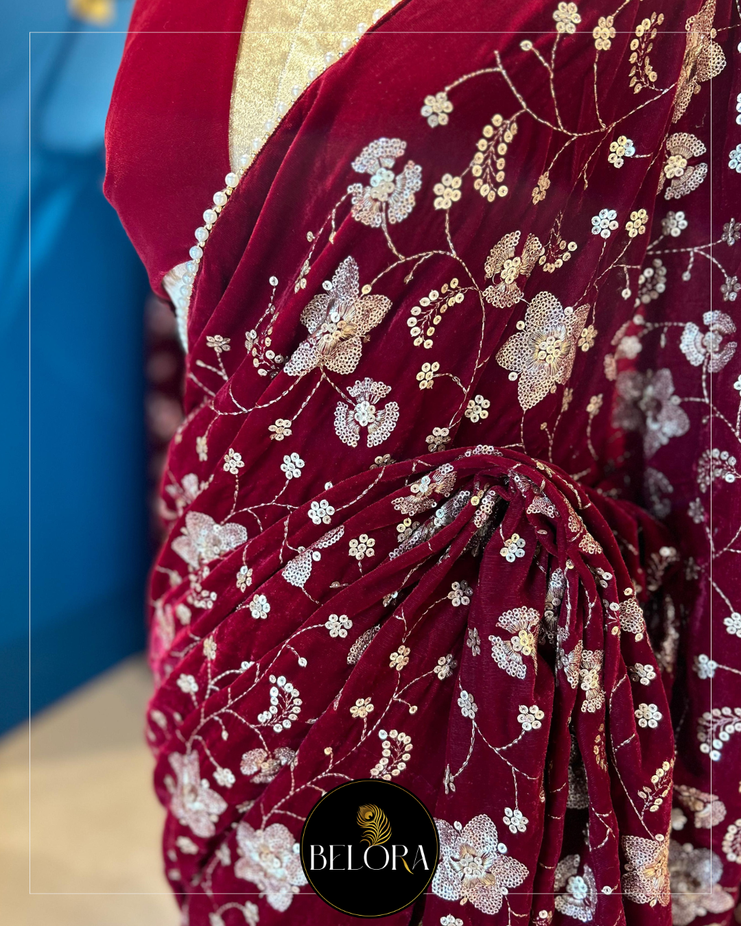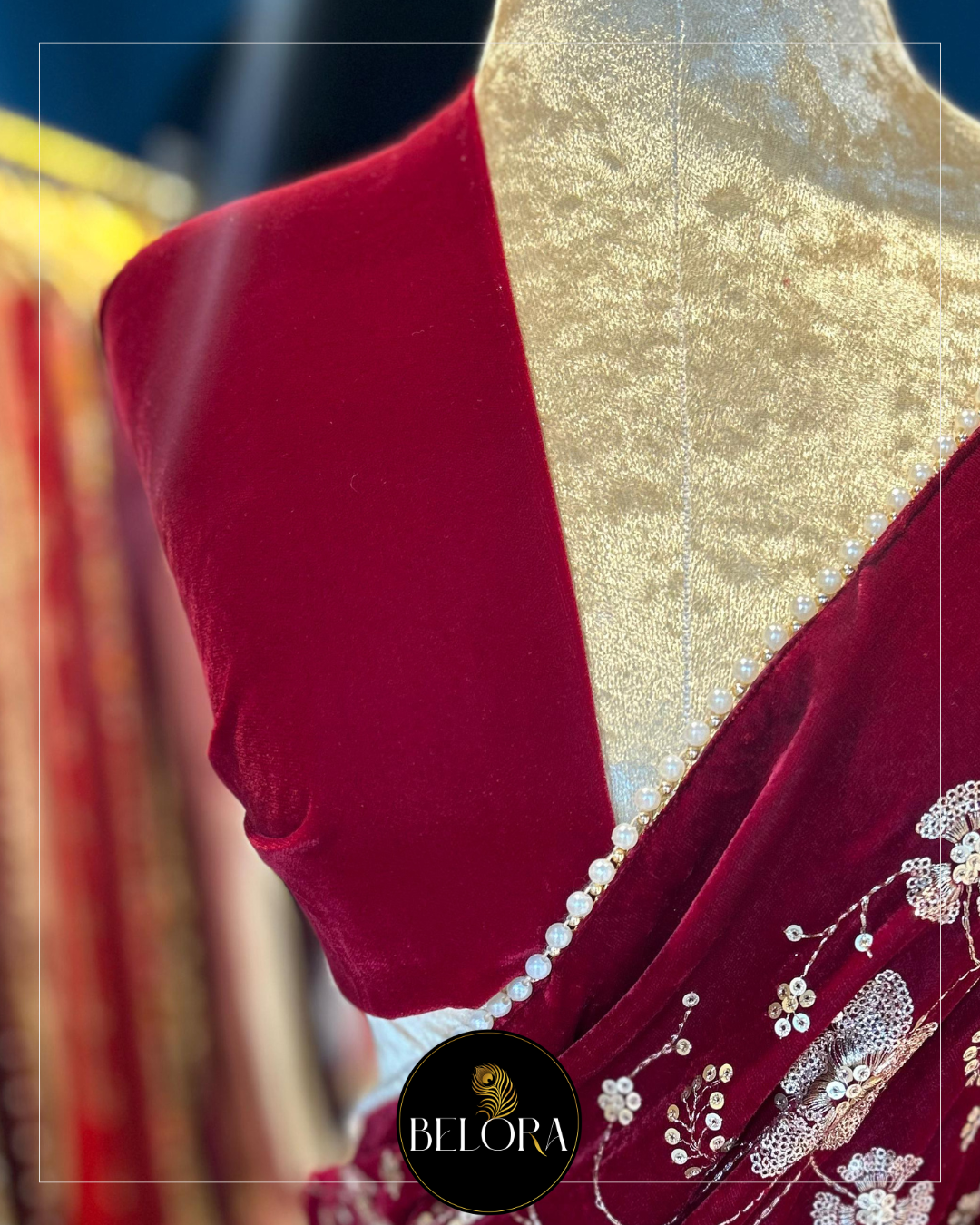 Saree: 6 yards of half and half embroidery velvet saree in Red colour and designed with white pearls.