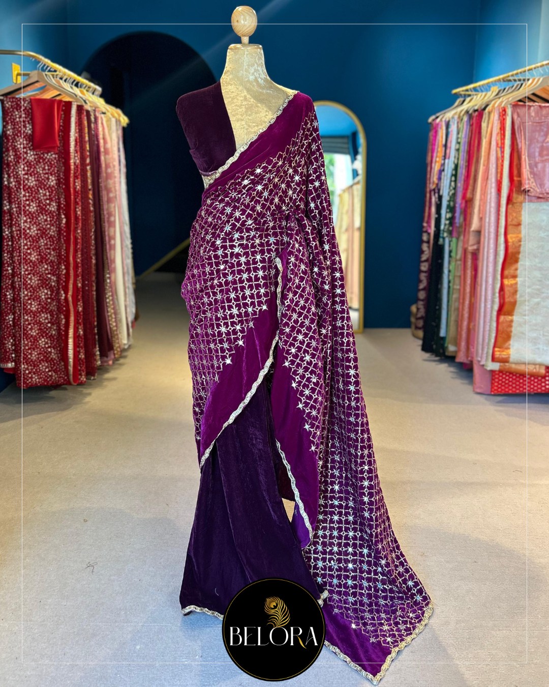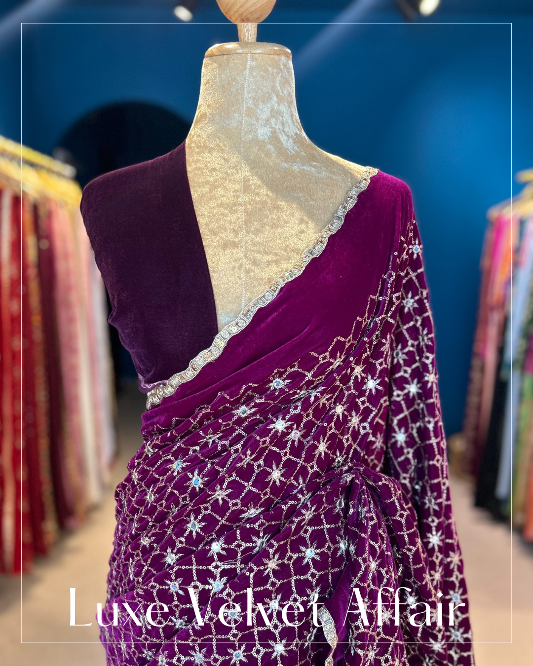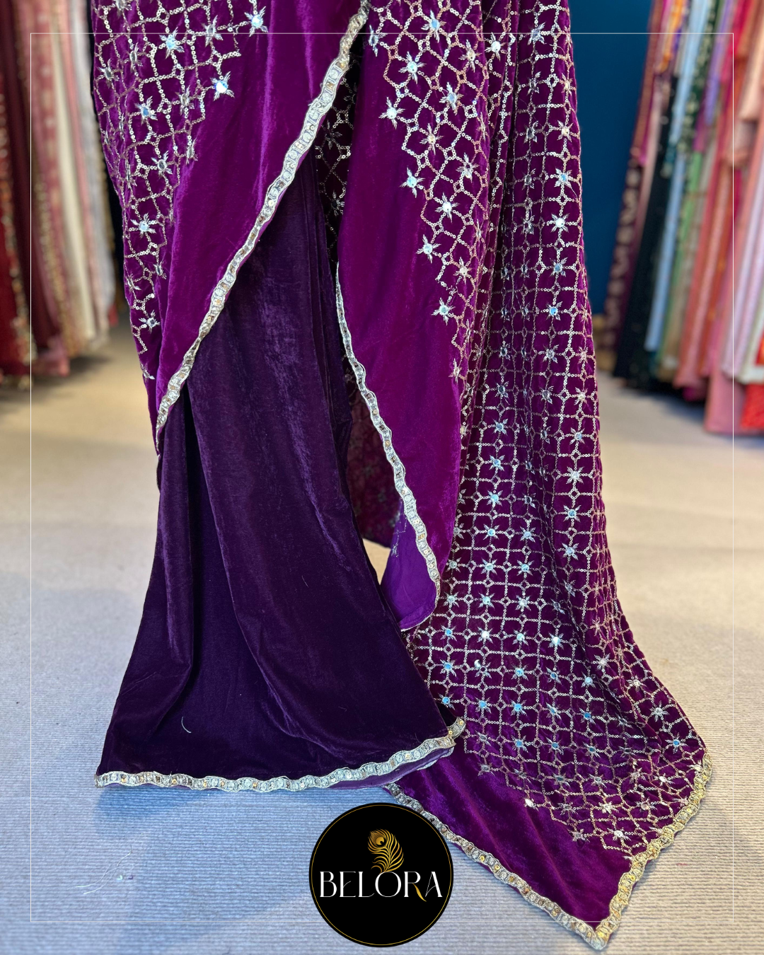 Saree: 6 yards of half and half embroidery velvet saree in Purple colour and designed with rose gold designer lace.