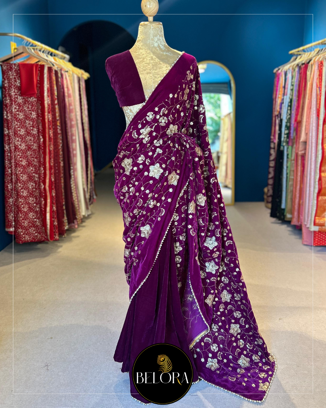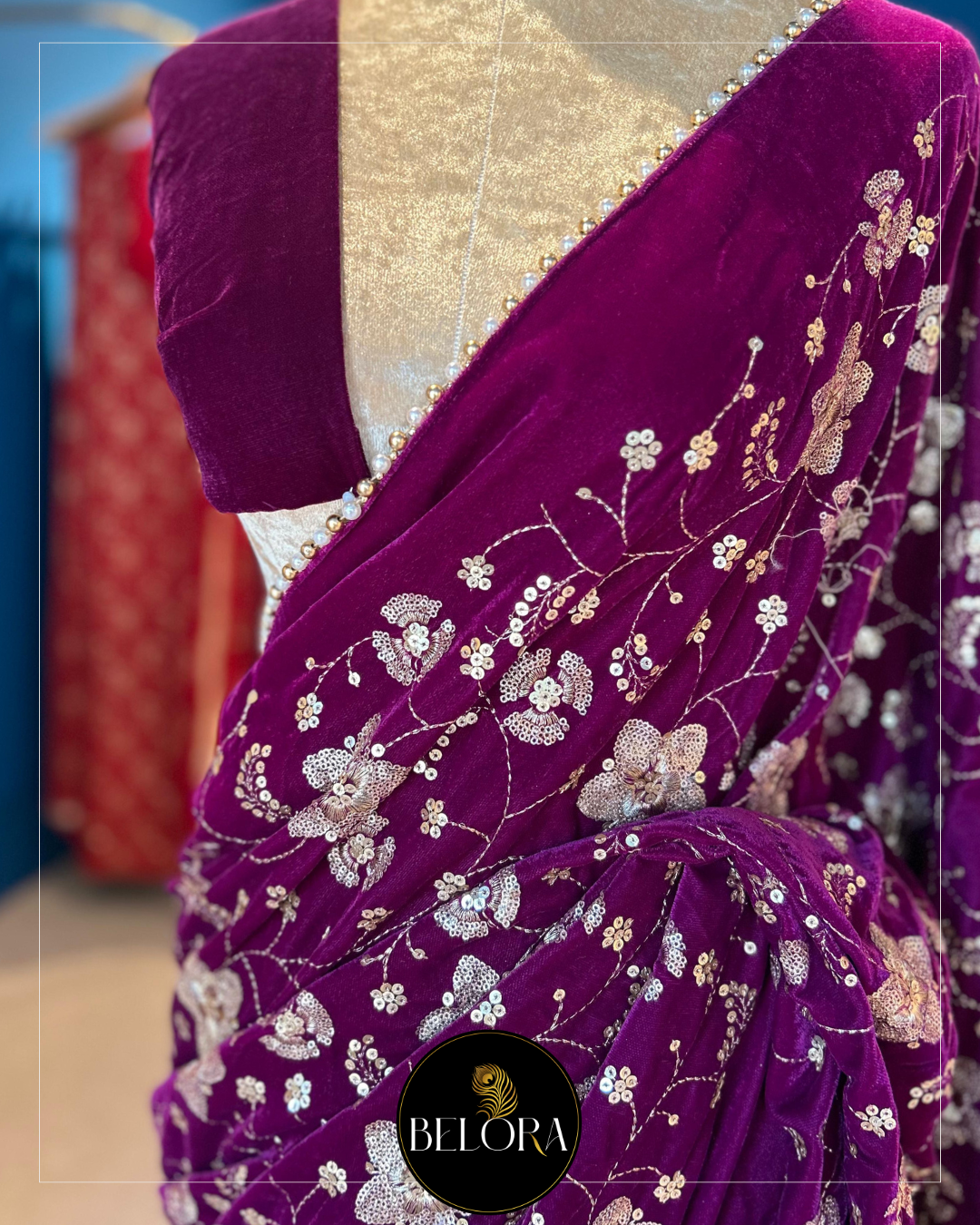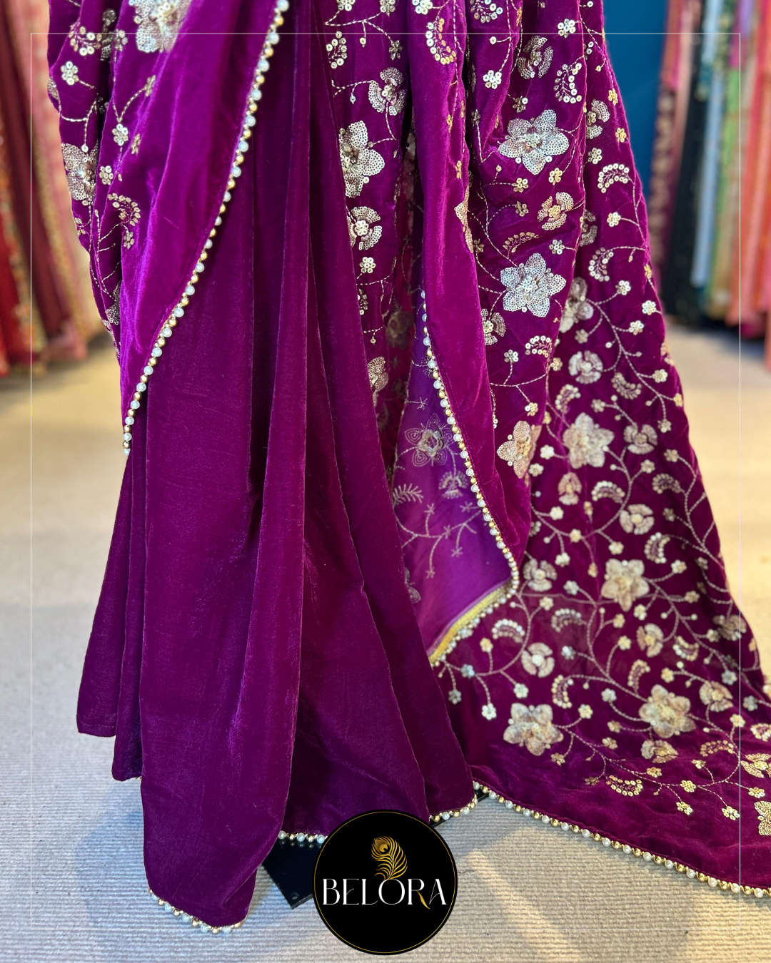 Saree: 6 yards of half and half embroidery velvet saree in Purple colour and designed with white and gold pearls.