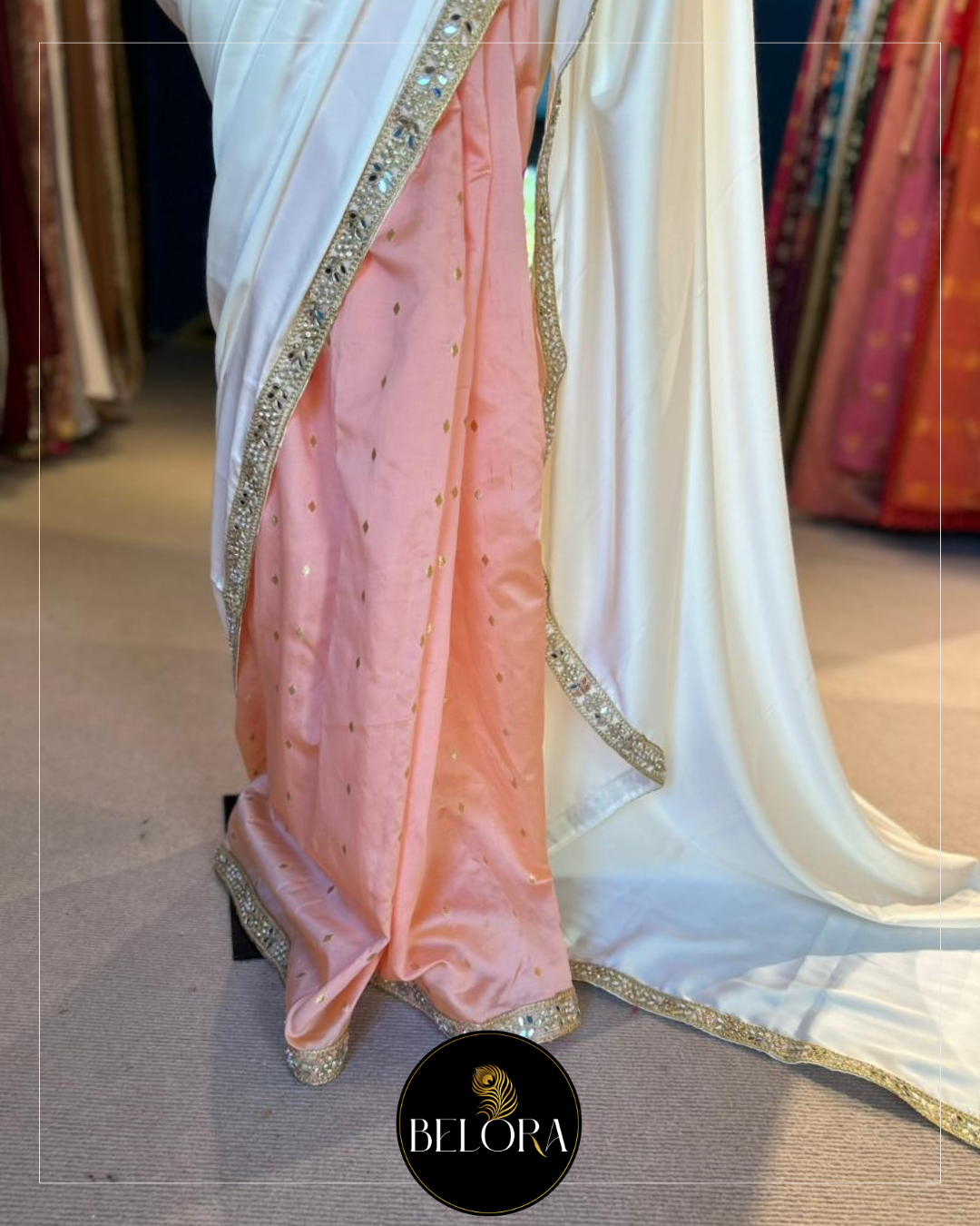 Saree: 6 yards of half and half Ivory Armani silk fall and Peach soft brocade bottom saree designed with gold designer lace.