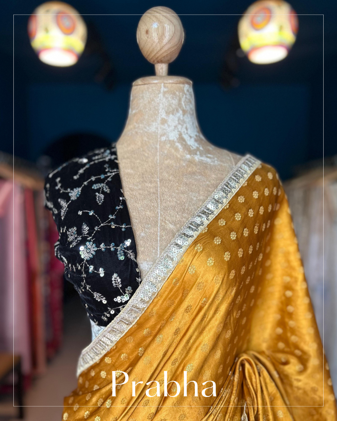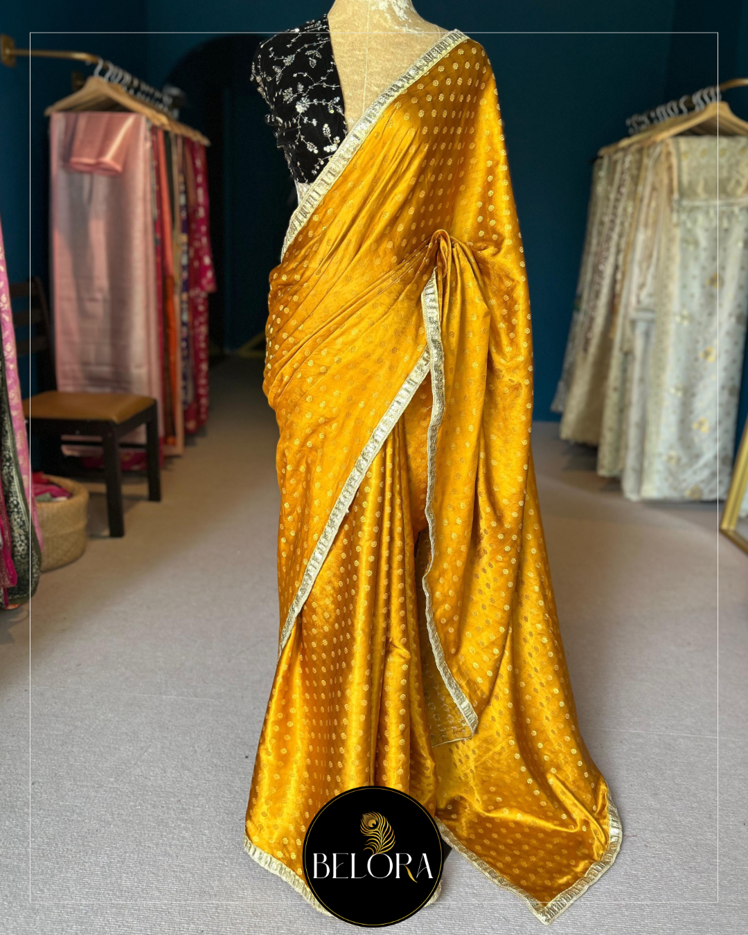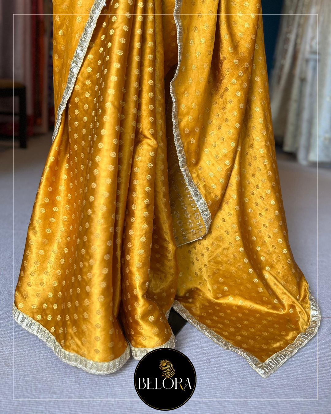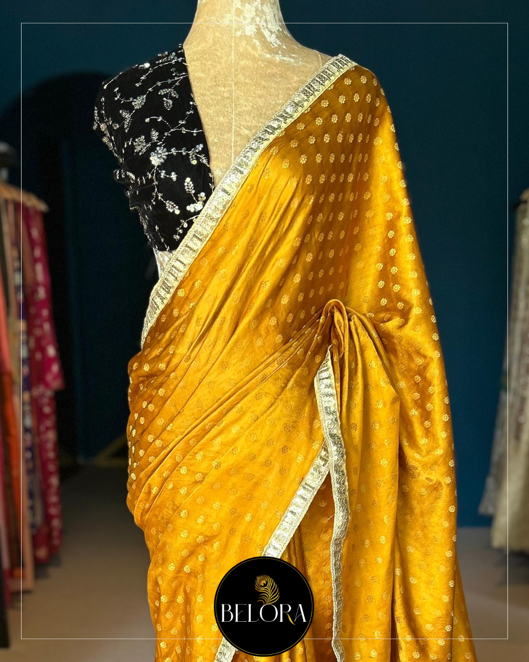 Saree: 6 yards of Silk Brocade saree in Mustard Yellow Colour and Beige Sequin Border.