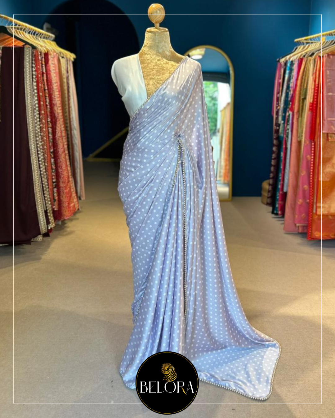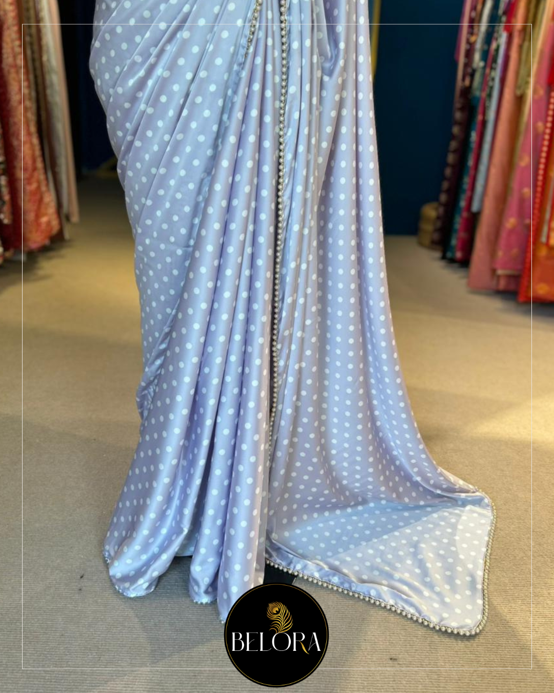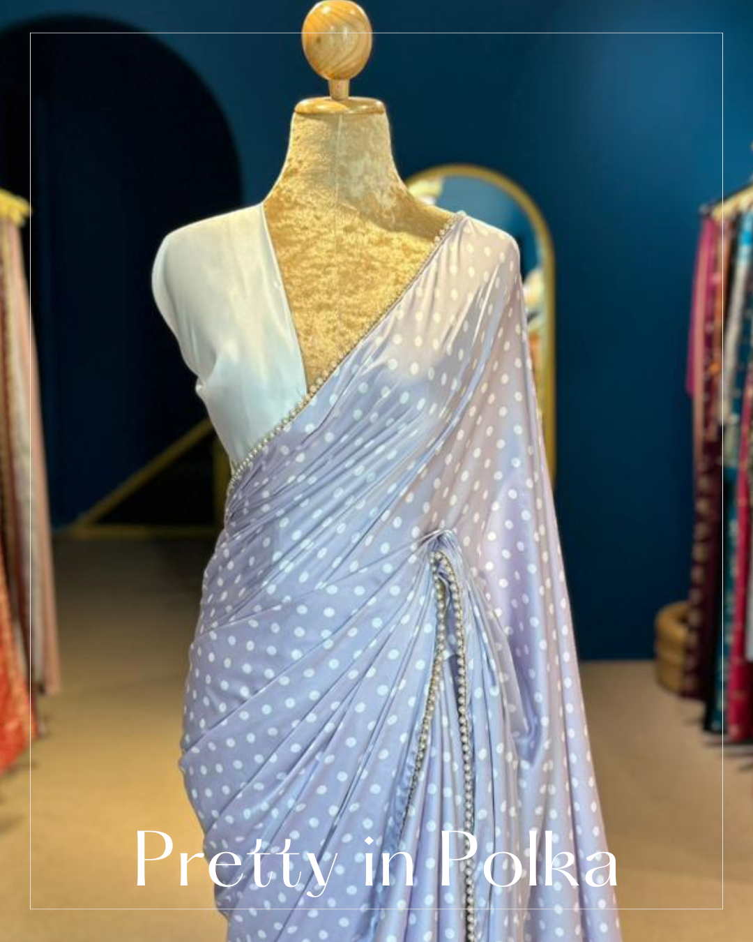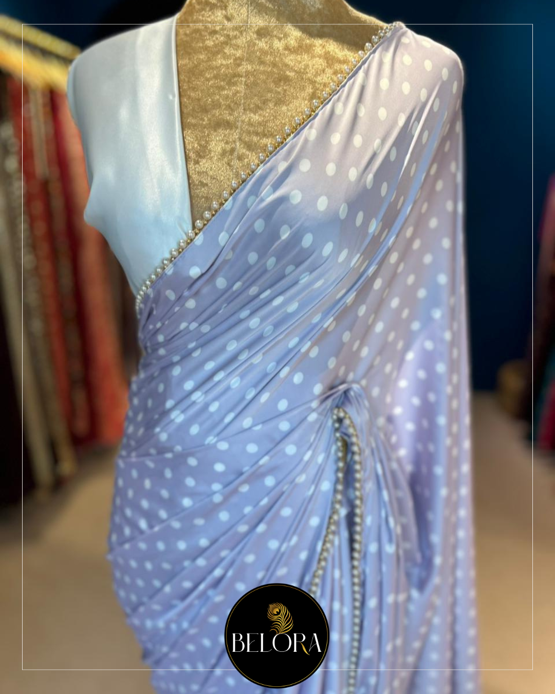 Saree: 6 yards of Polka dot Armani silk saree in Light purple colour and designed with pearls.