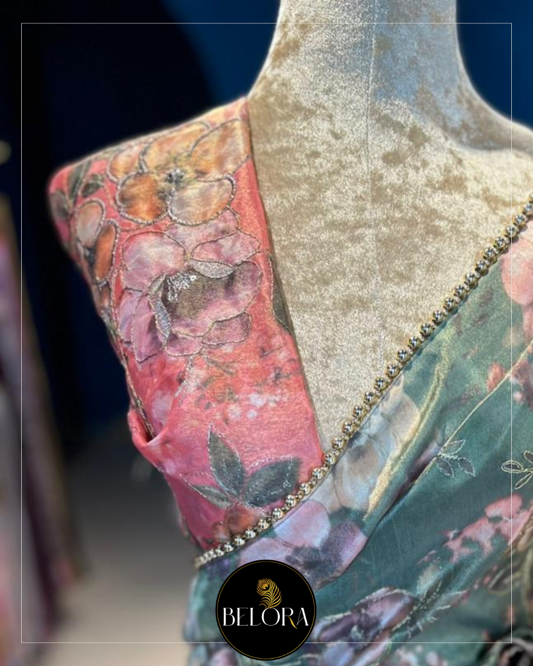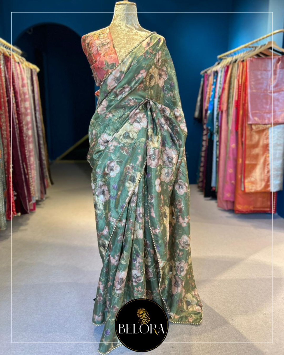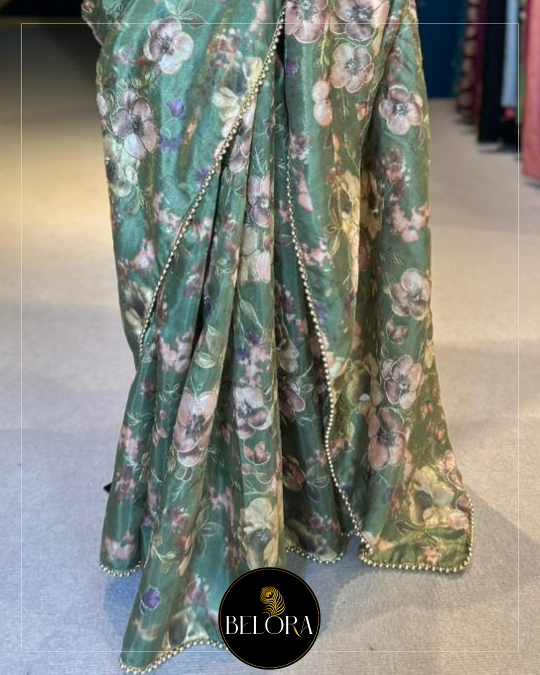 Saree: 6 yards of floral embroidered organza saree in Dark green colour and designed with pearls.