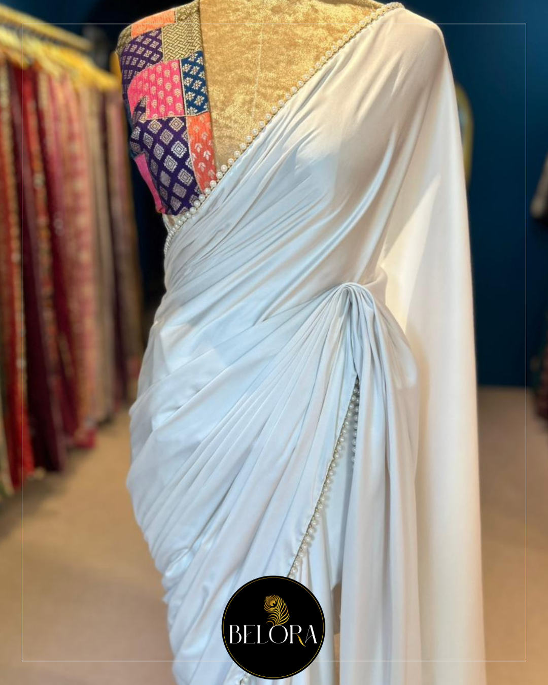 Saree: 6 yards of Armani silk saree in Smoke white colour designed with pearls.