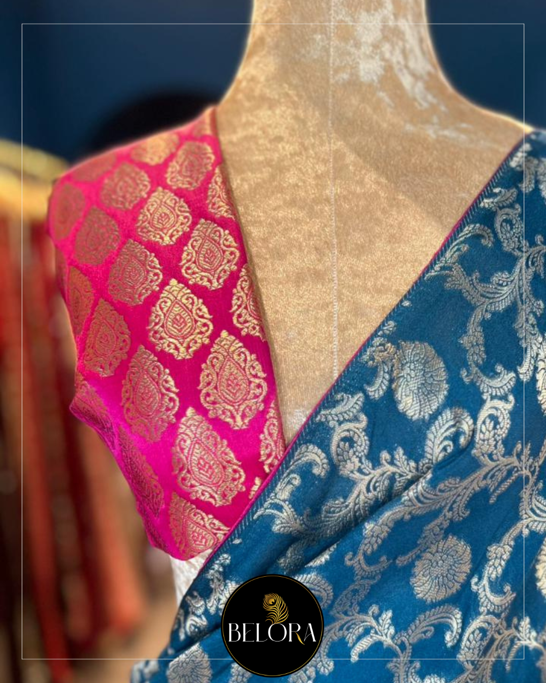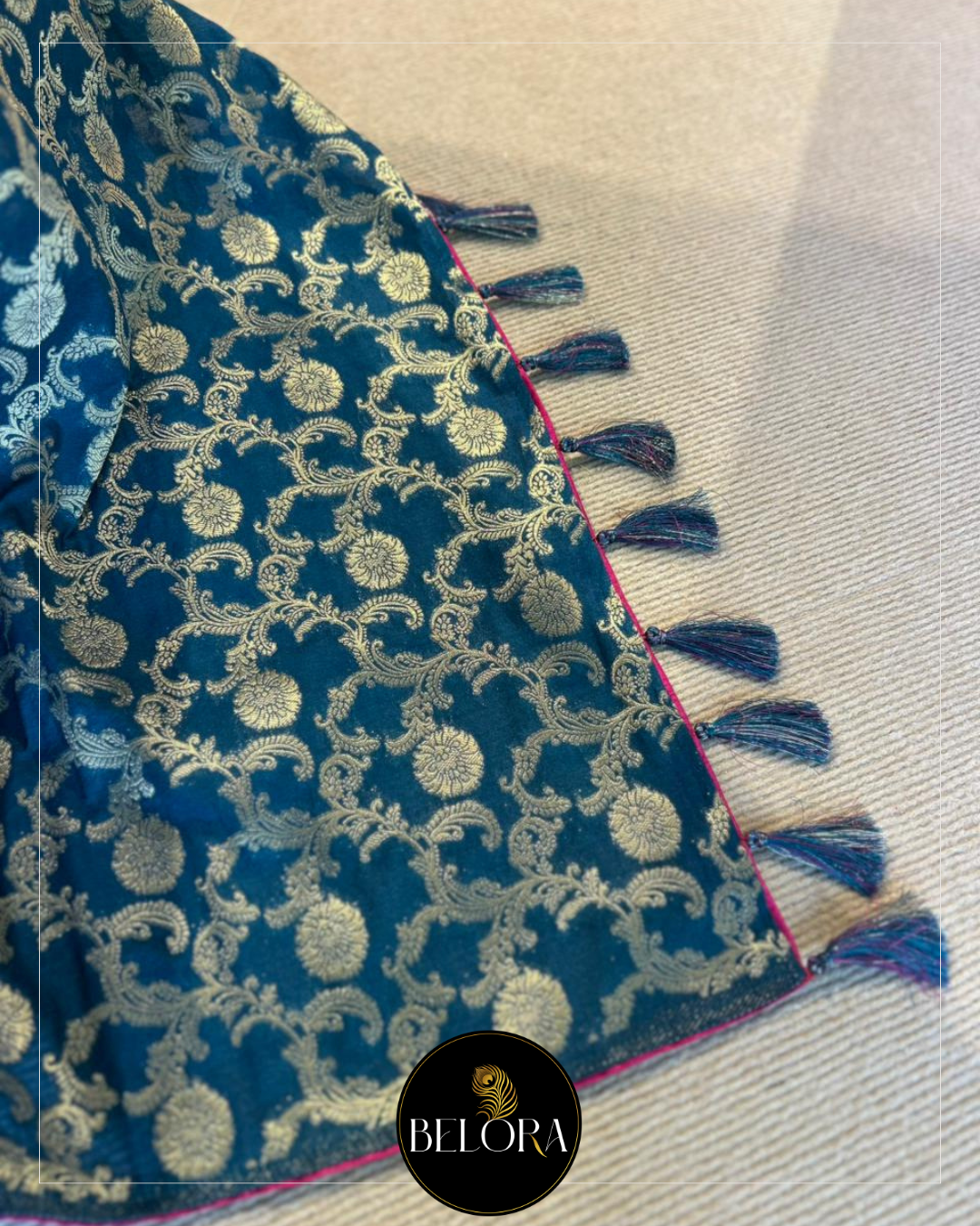 Saree: 6 yards of soft brocade saree in Peacock blue colour and designed with magenta piping and tussels.