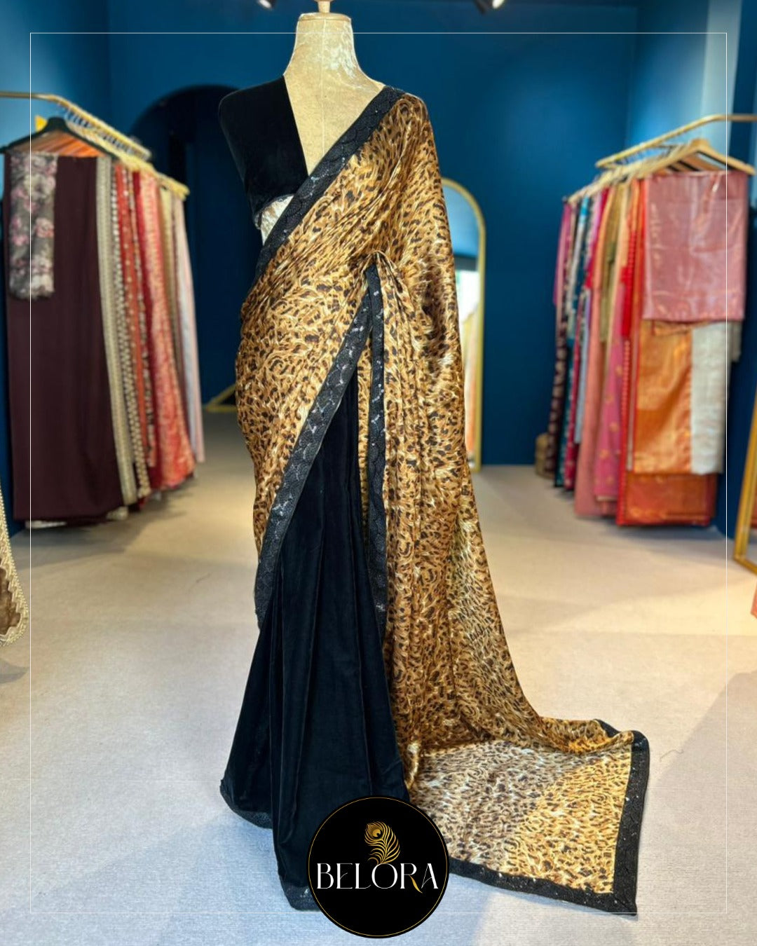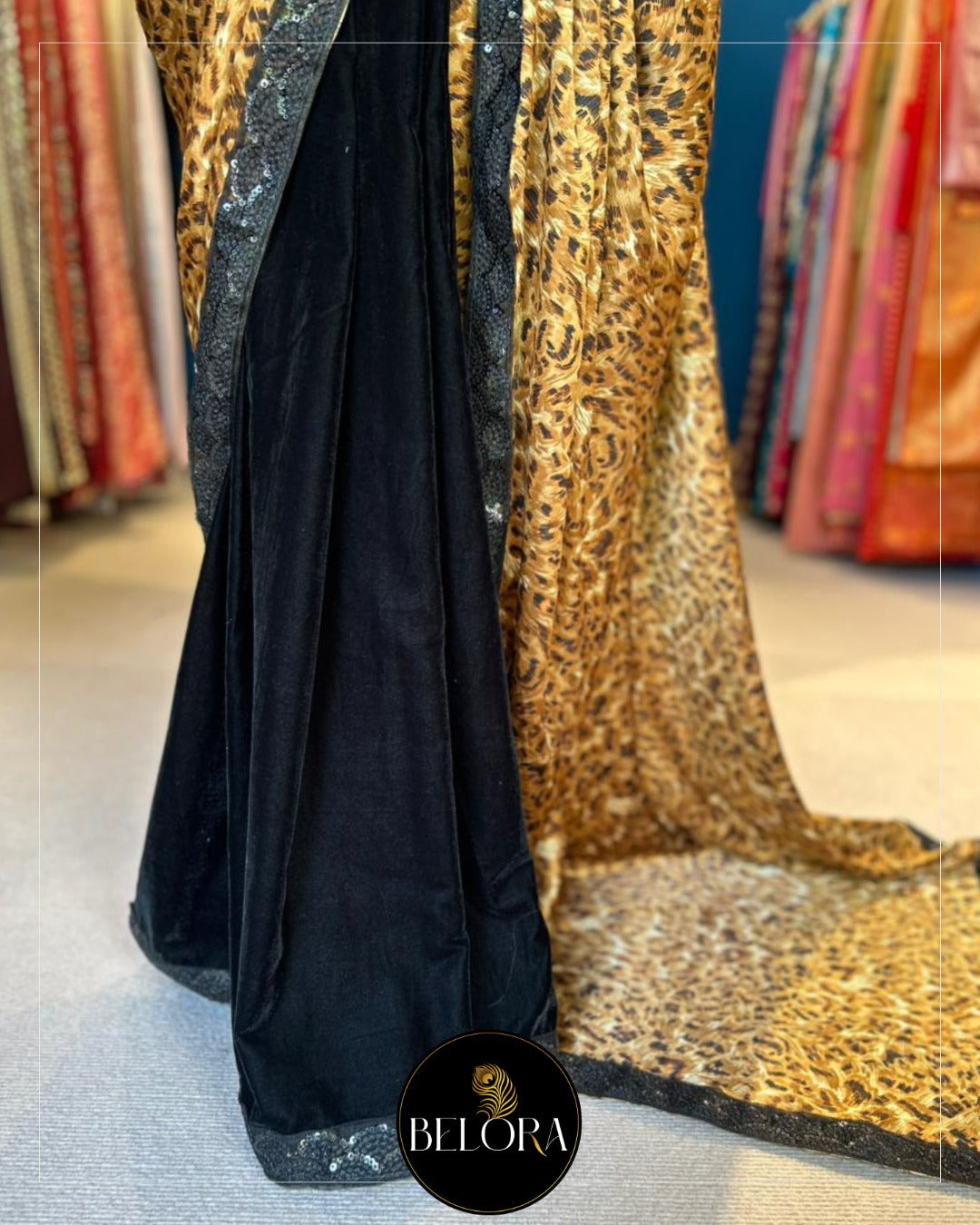Saree: 6 yards of half and half Printed Armani silk fall and black velvet bottom saree designed with black designer lace.