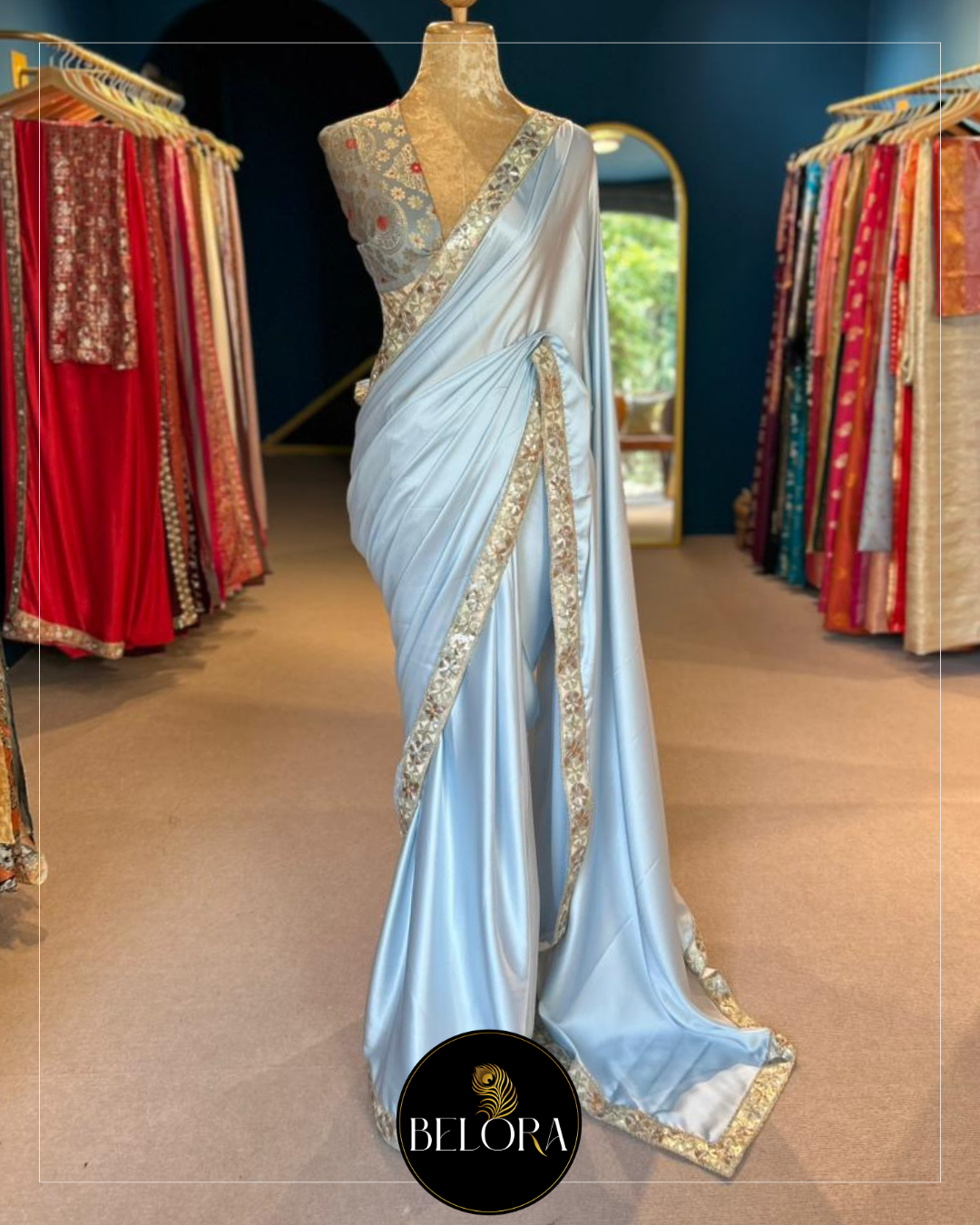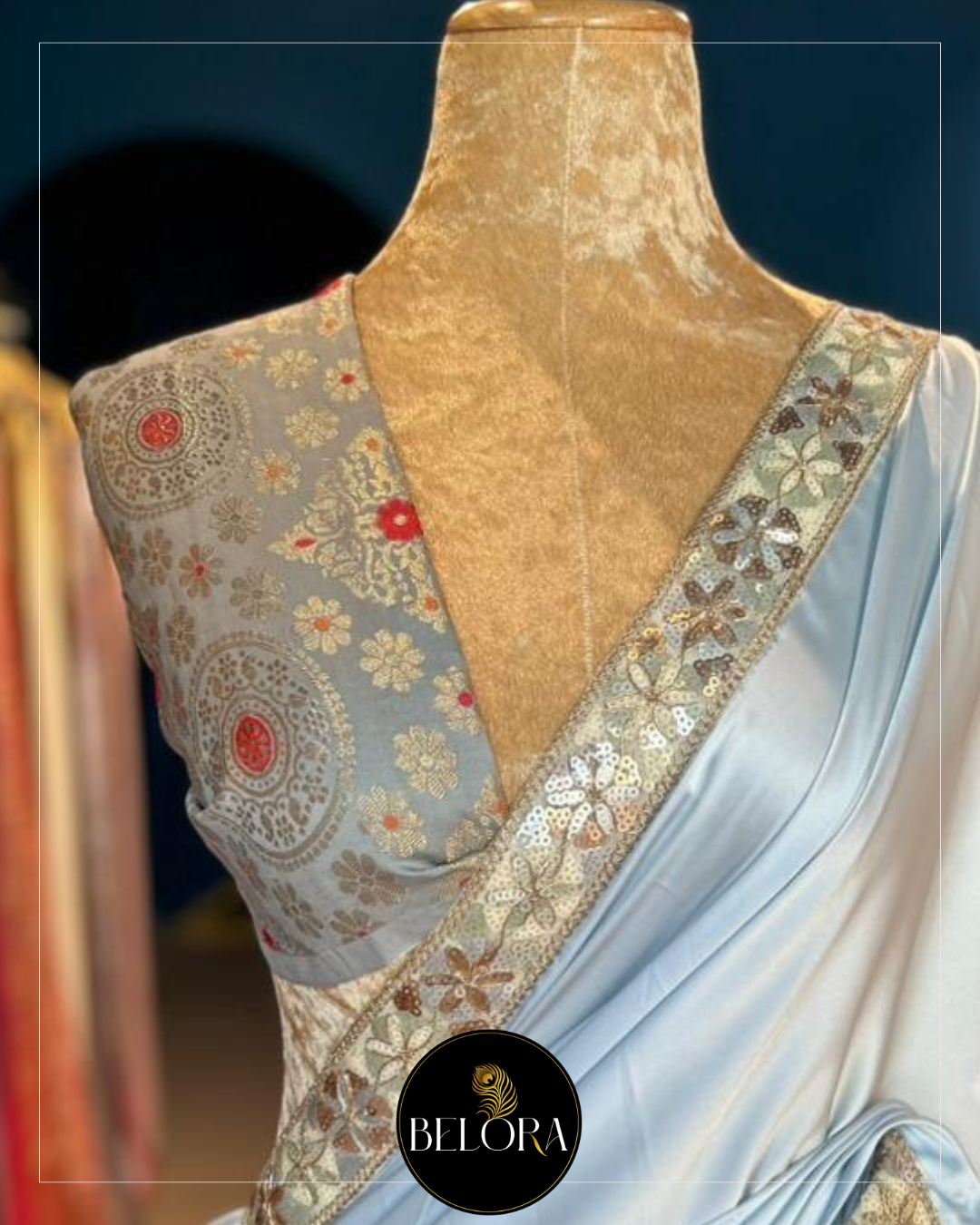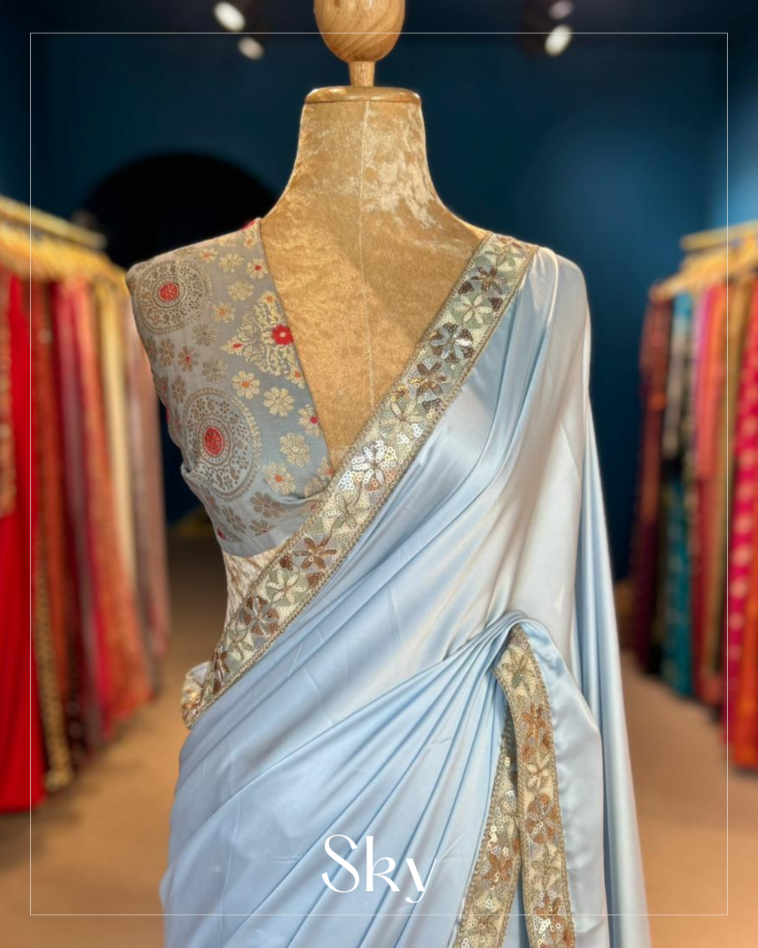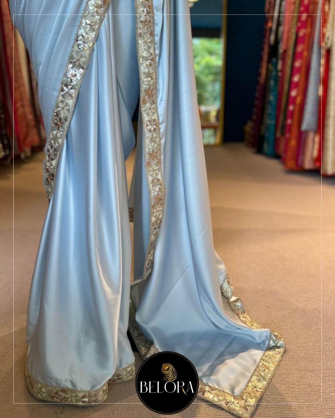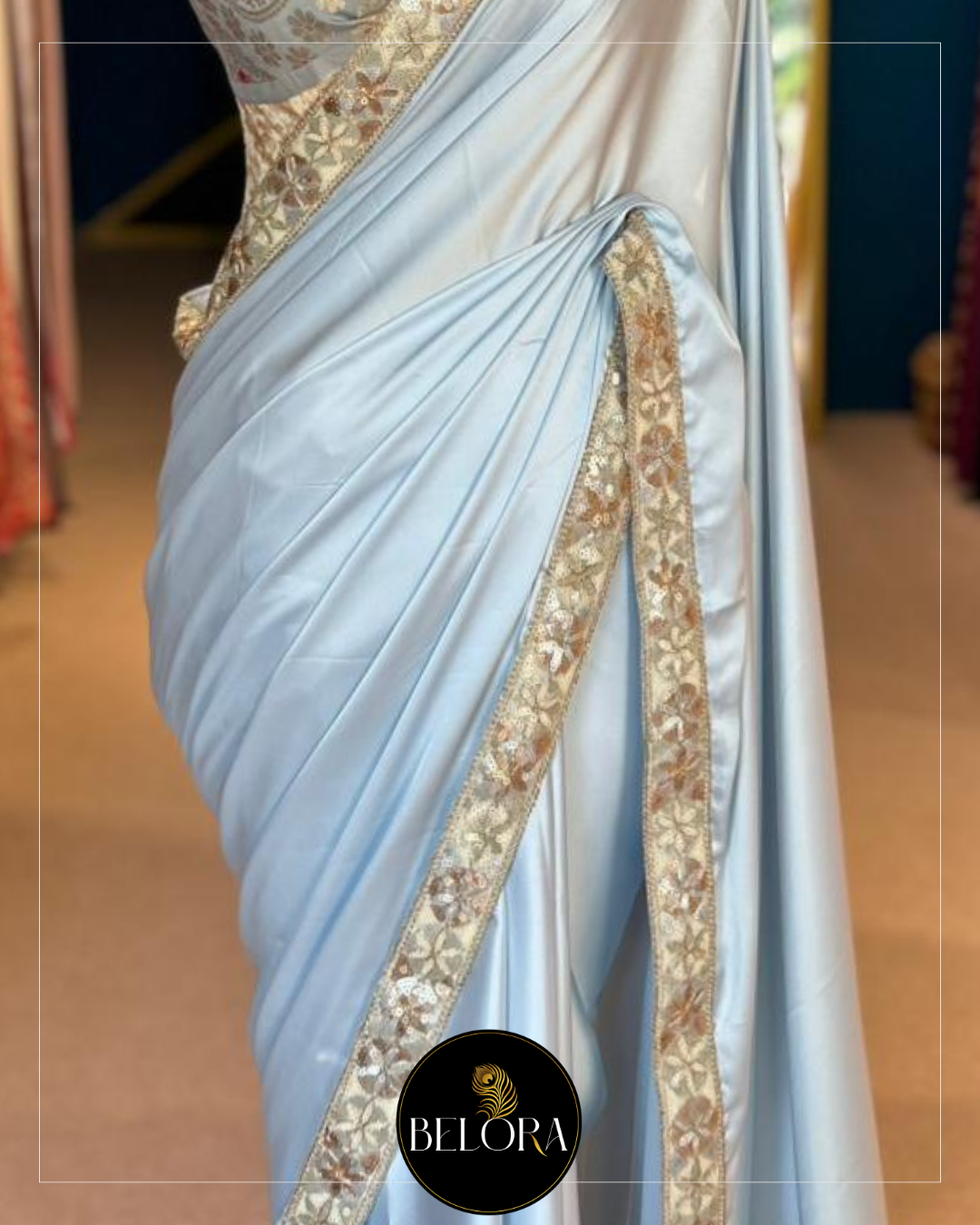 Saree: 6 yards of Armani silk saree in Sky blue colour and designed with multicolor sequin designer lace.