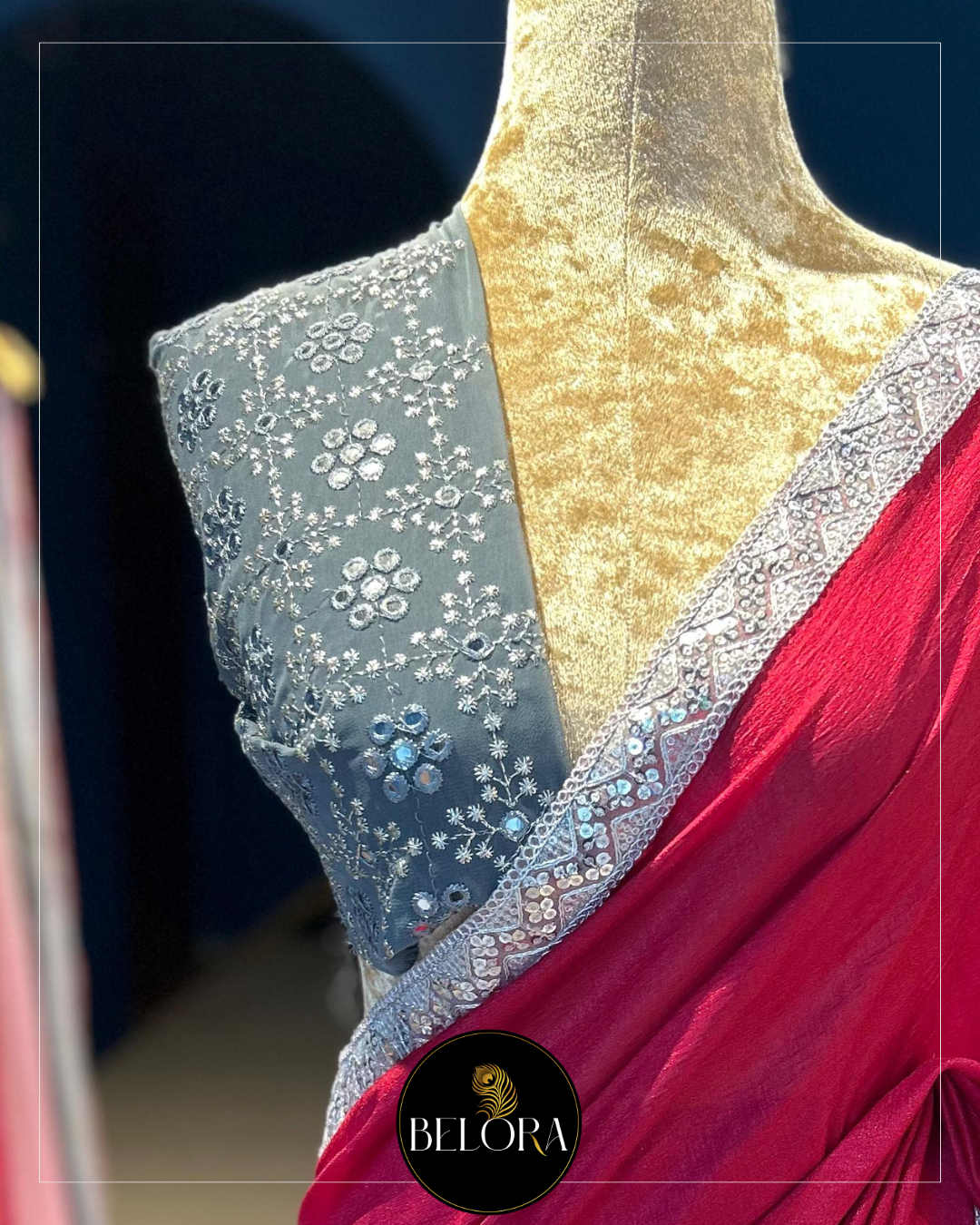 Saree: 6 yards of soft silk saree in Wine red colour and designed with silver designer lace.
